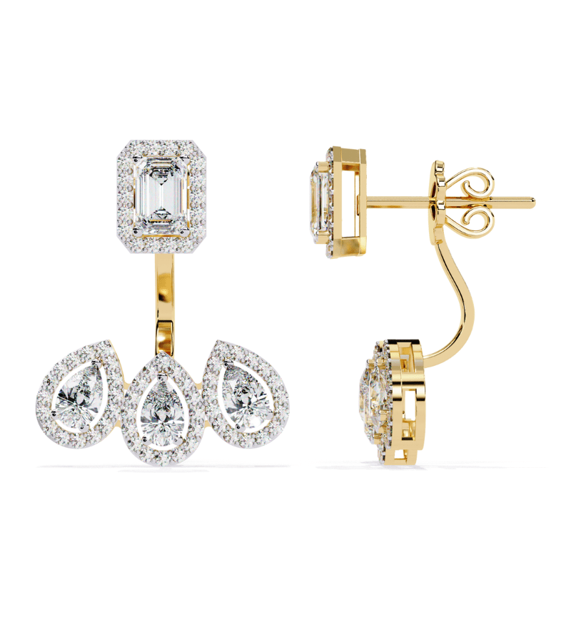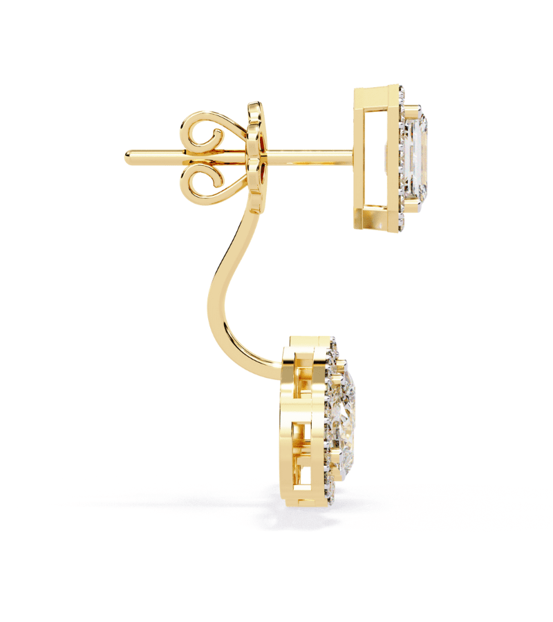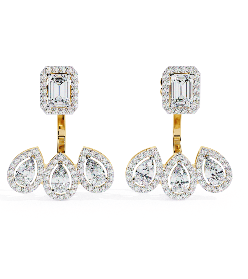 Aurora Halo Diamond Drop Earrings pair a sparkling rectangular halo stud with a cascading trio of diamond clusters that form a radiant, floral-inspired motif. Each cluster features pear- and teardrop-shaped centers surrounded by a halo of pavé diamonds, all set in warm gold-tone metal that enhances the stones’ brilliance. The design blends classic elegance with contemporary sparkle, creating a statement piece suitable for gala occasions, weddings, or upscale soirées. Carefully engineered for comfort and balance, these earrings offer enduring beauty and a refined, high-glamour presence.