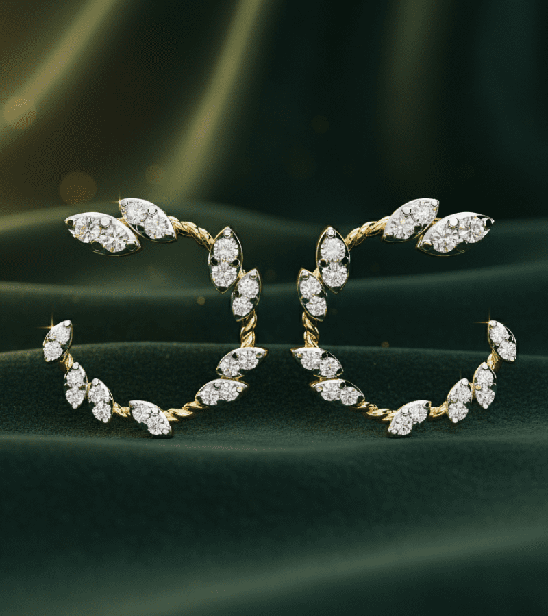 Aurora Leaf Diamond Hoops celebrate a delicate botanical motif with curling, leaf-shaped pavé clusters set along a twisted gold-tone hoop. Each leaf glitters with multiple tiny diamonds, catching light from every angle as the design winds gracefully around the ear. The warm metal backdrop enhances the stones’ fire, delivering a refined, nature-inspired statement piece. Perfect for gala nights, weddings, or upscale evenings, these earrings blend timeless sophistication with modern botanical charm.