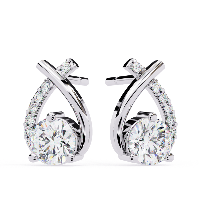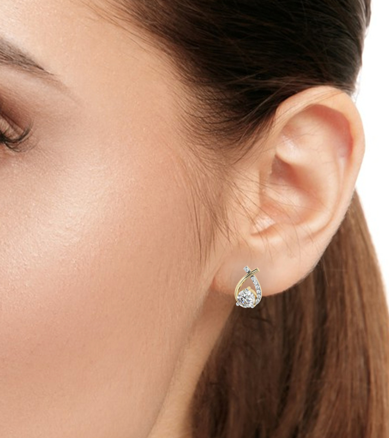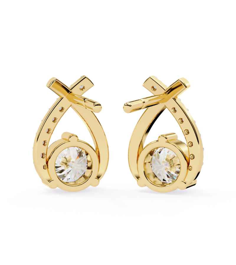 These earrings showcase a luminous pair of gold-tone settings where a bold, curved ribbon wraps around a central round diamond, creating a dynamic, sculptural silhouette. The main stone is held securely in a classic cradle, while a delicate pavé-accented arc sits above, catching light from every angle and imparting a continuous stream of sparkle. The warm gold tone enhances the clarity and fire of the stones, delivering a refined, statement-making look. Finished with secure backings, they offer luxurious style for special occasions or adding a touch of glamour to sophisticated daywear.