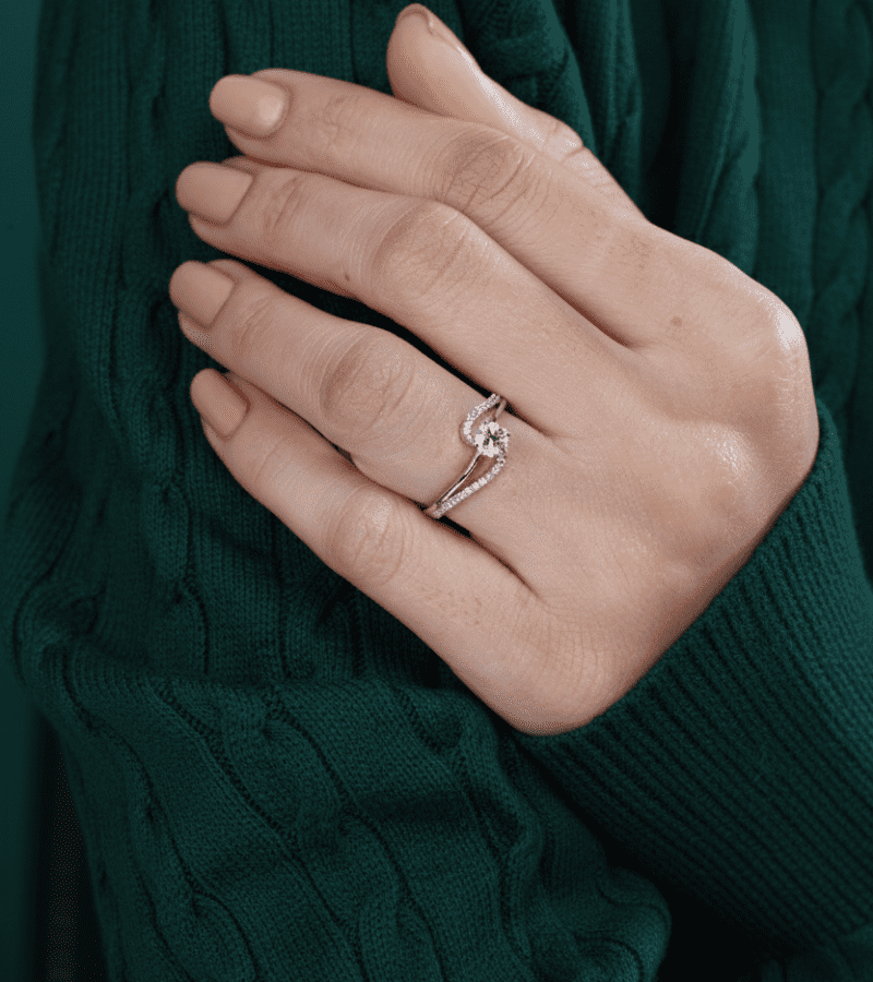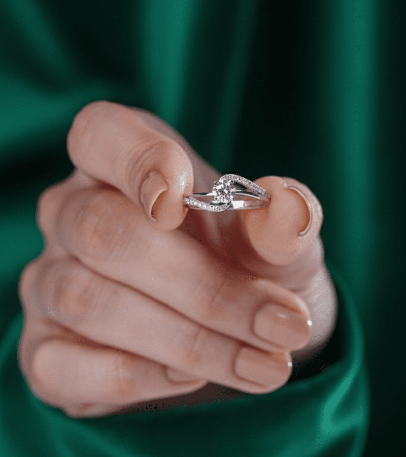- Design: split shank that wraps into a secure basket for the round center diamond.