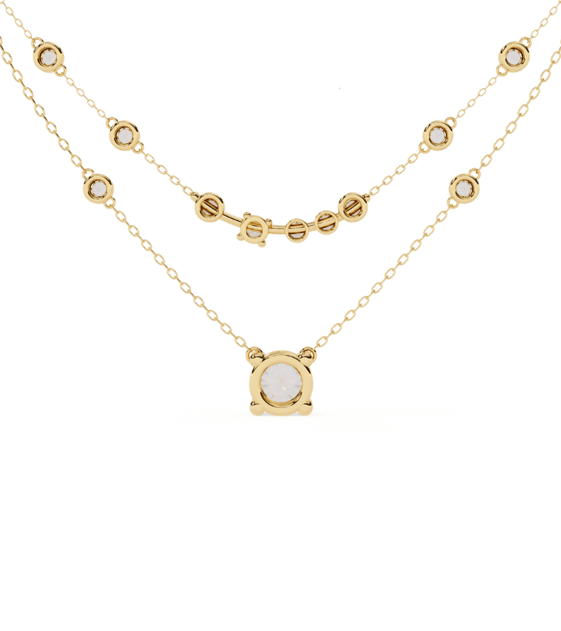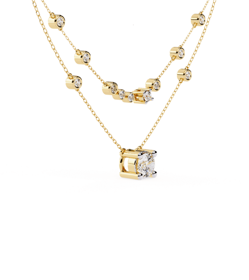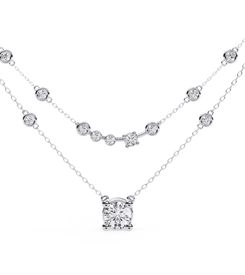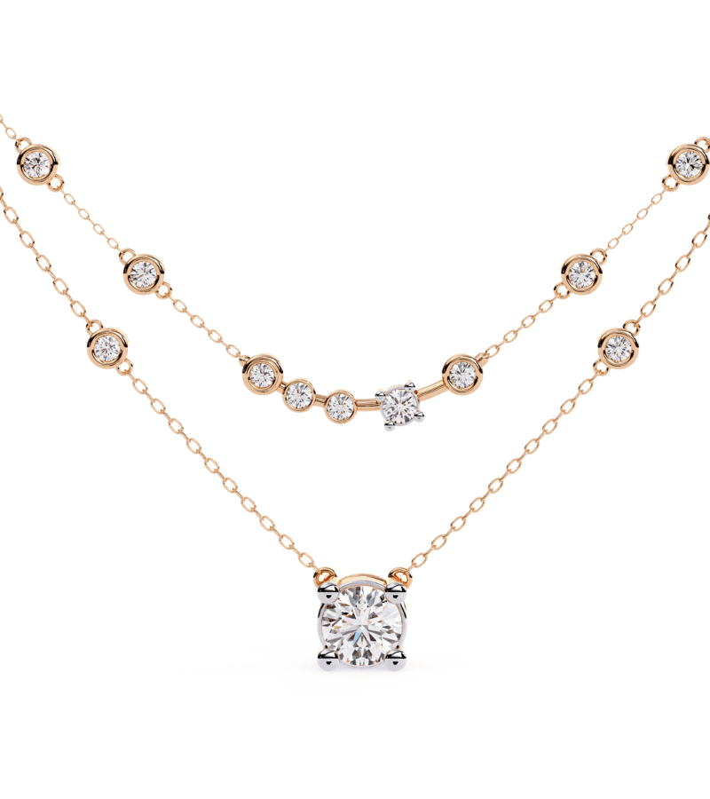 - Design: two-layer chain look with a prominent central solitaire pendant surrounded by a micro-halo.