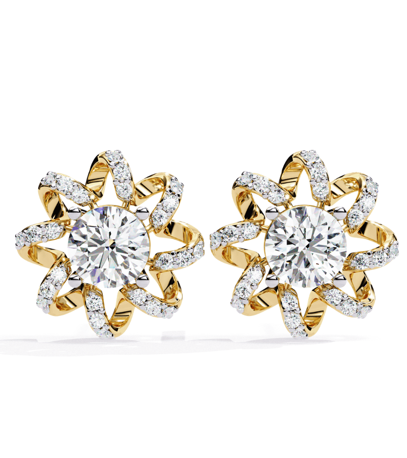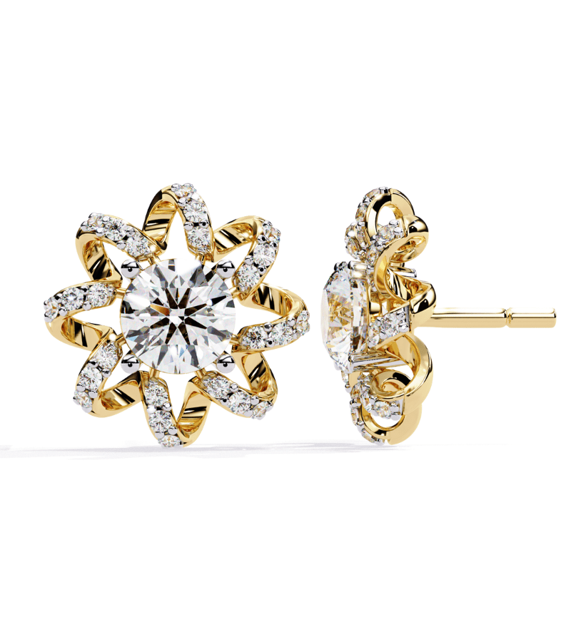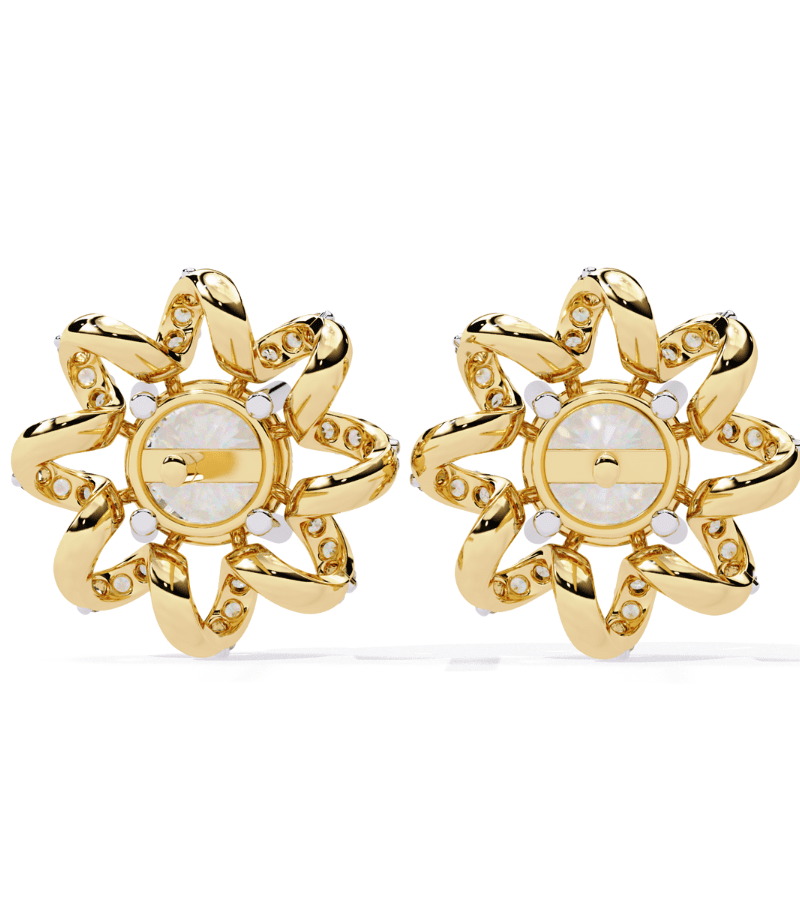 Celestial Bloom Diamond Earrings showcase a bold, flower-inspired design set in warm gold-tone metal. A brilliant central diamond is embraced by a surrounding starburst of looping arms encrusted with pavé diamonds, forming a luminous floral corona. The symmetric composition and generous diamond pavé catch light from every angle, producing a radiant, chandelier-like brilliance in a compact stud silhouette. Perfect for weddings, galas, or upscale events, these earrings combine classic craftsmanship with contemporary sparkle, delivering a statement piece that exudes luxury and refined elegance.