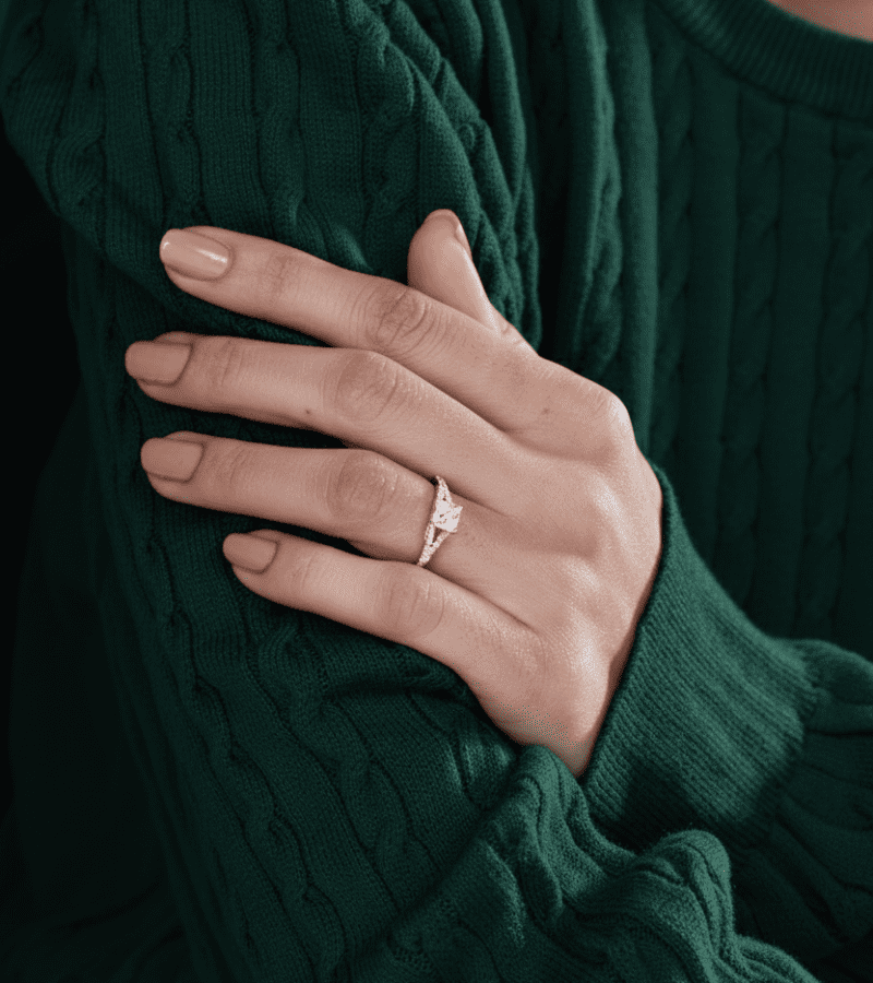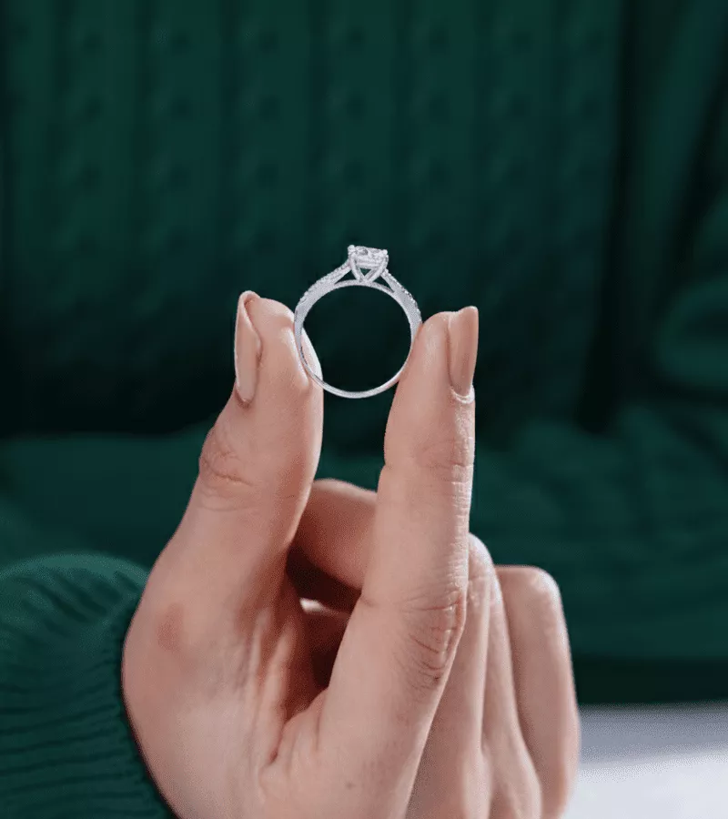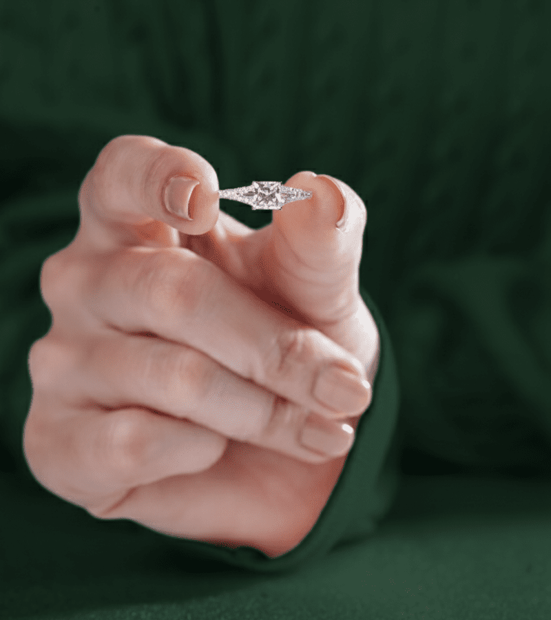 - Design: square-cut center diamond framed by a sparkling pavé halo and accent stones along the shoulders.