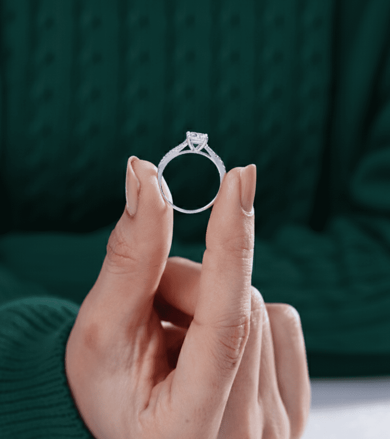 Silver-tone ring with a radiant square-cut center diamond and a pavé-accented halo along a slender band.- Design: square-cut center diamond framed by a sparkling pavé halo and accent stones along the shoulders.