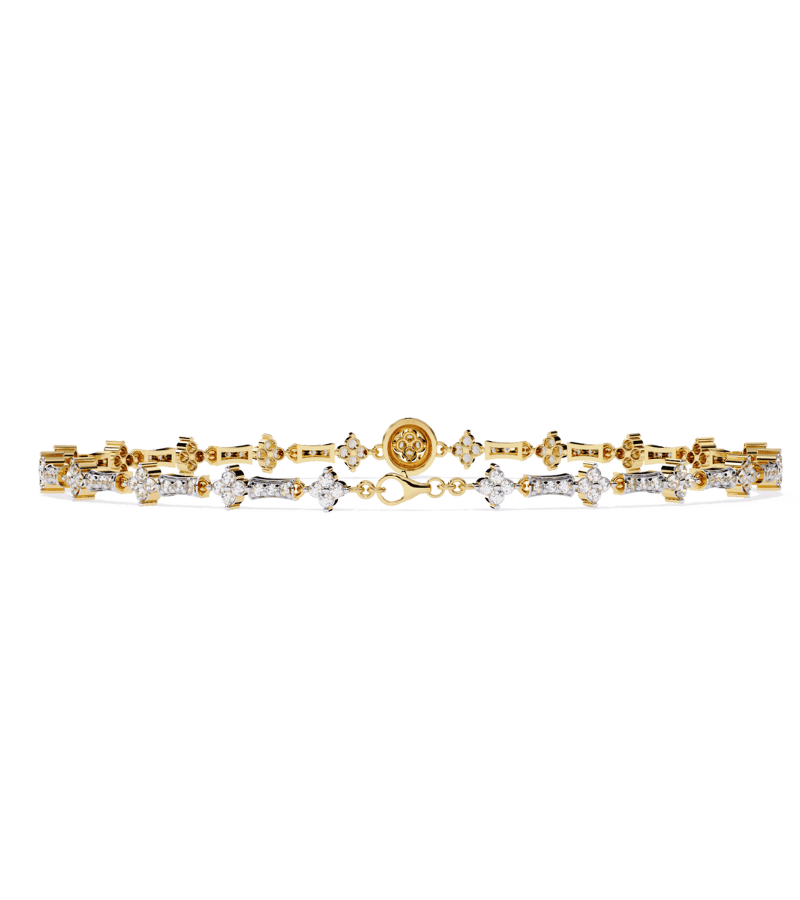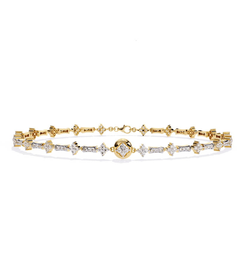 This bracelet showcases a refined two-tone design where gold and white settings alternate in a seamless link pattern. Each link is adorned with pavé diamonds arranged in a geometric, star-like motif, culminating in a small central round accent that adds a focal point of light. The piece’s balanced symmetry and gentle shimmer create a timeless, sophisticated accessory that pairs beautifully with both casual and formal ensembles. Perfect for gifting, anniversaries, or elevating everyday luxury.