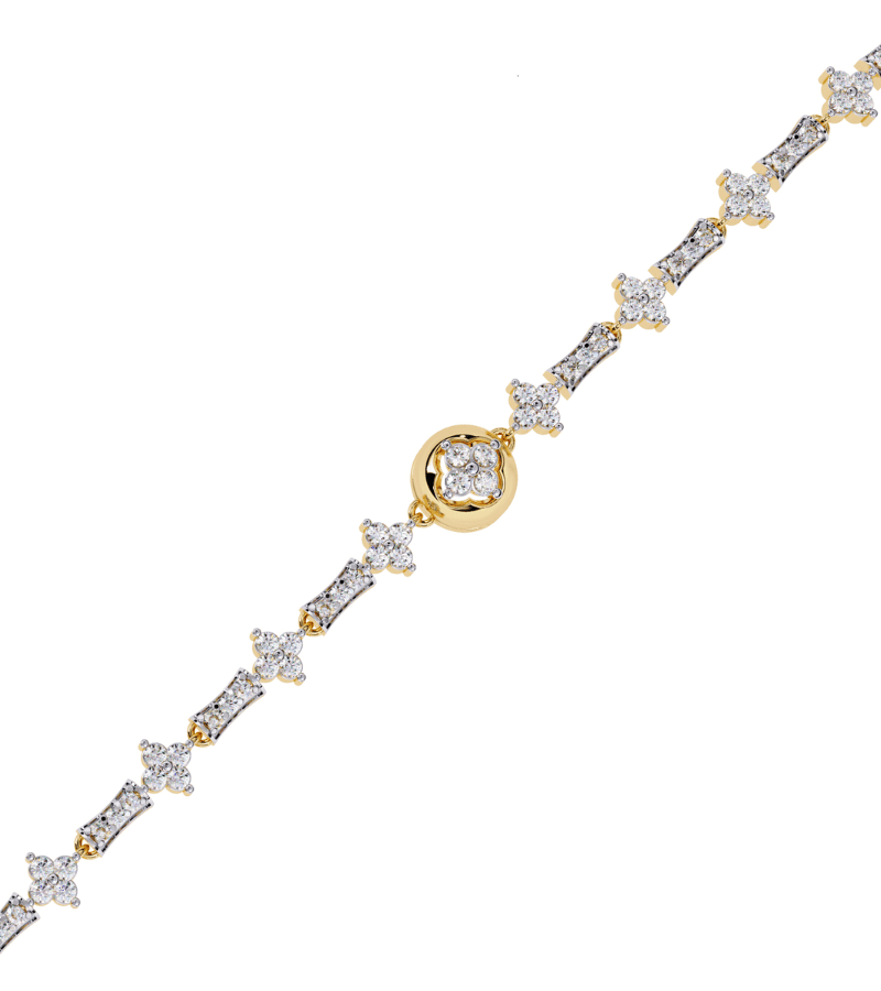 Delicate bracelet in gold and white tones featuring a repeating link of diamond-cluster motifs and a central round motif for subtle sparkle.