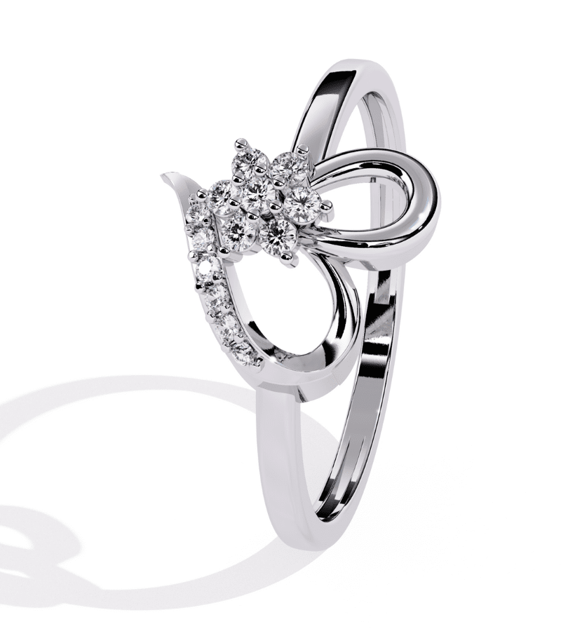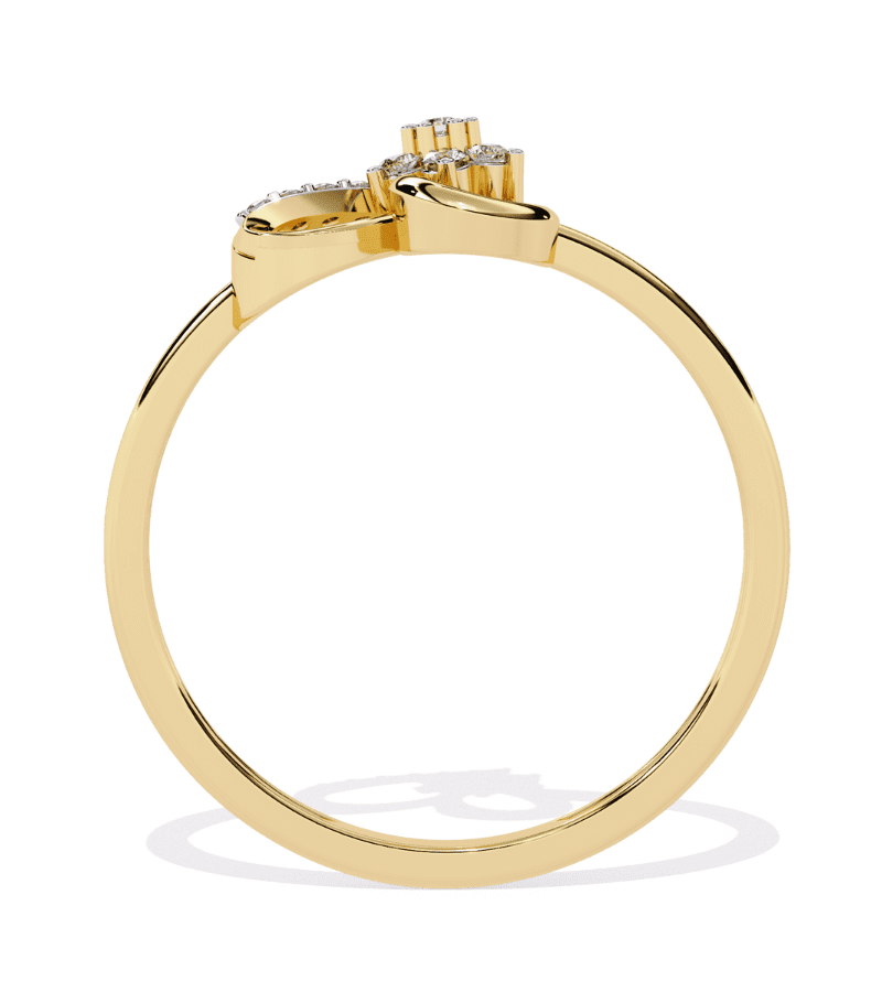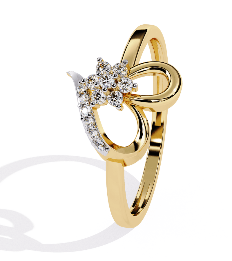 Gold-tone ring featuring a looping crescent motif intertwined with a cluster of pavé diamonds arranged in a floral centerpiece, accented with a curved row of diamonds along the band.- Design: intertwined crescent silhouette with a central flower cluster of pavé diamonds.