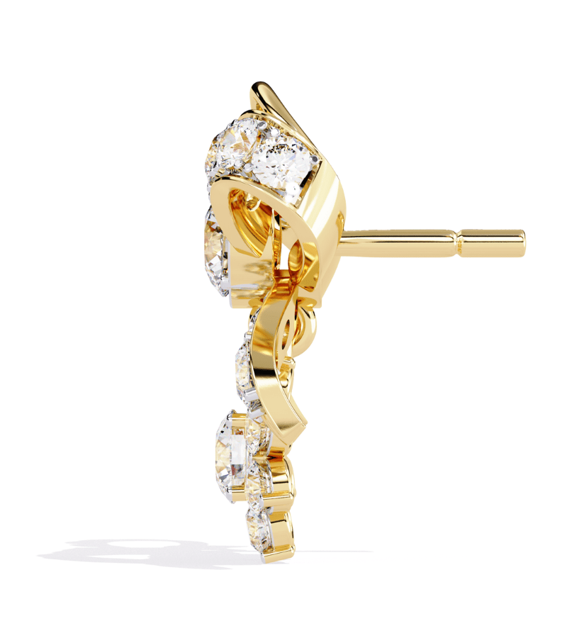 Elegant bow-shaped earrings in gold with pavé diamonds and a clustered floral drop