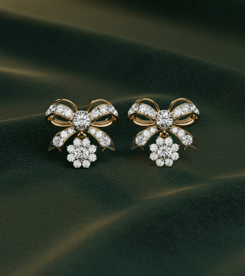 The Diamond Bow Filigree Earrings feature a refined gold bow motif where ribbon-like loops are encrusted with pavé diamonds, leading to a graceful floral cluster pendant that hangs beneath. The combination of intricate bow detailing and a shimmering diamond bloom creates a timelessly romantic piece with vintage charm and contemporary brilliance. Perfect for anniversaries, weddings, or elevating everyday elegance