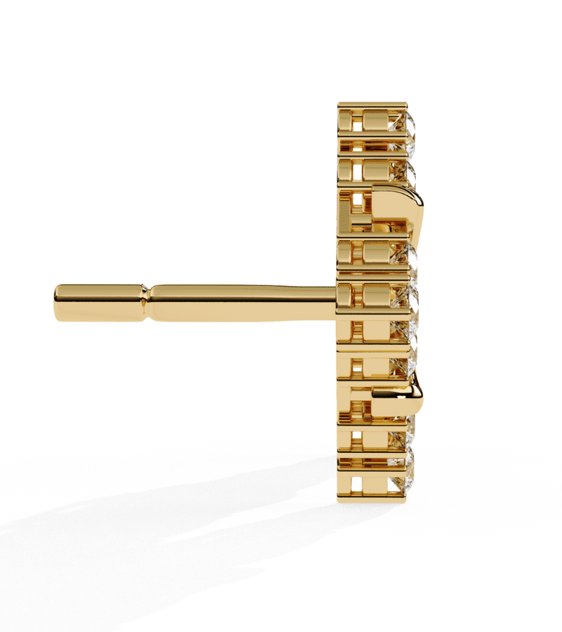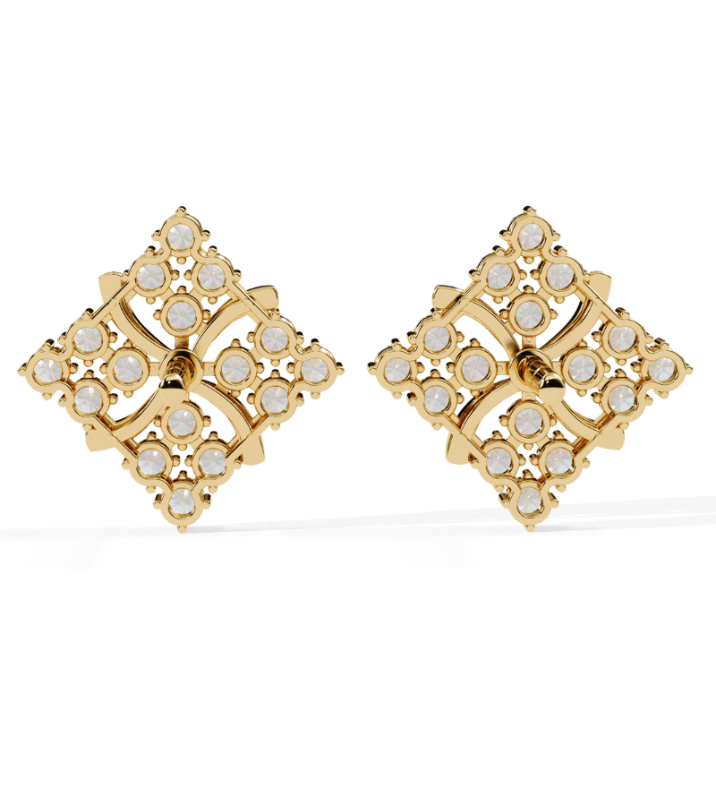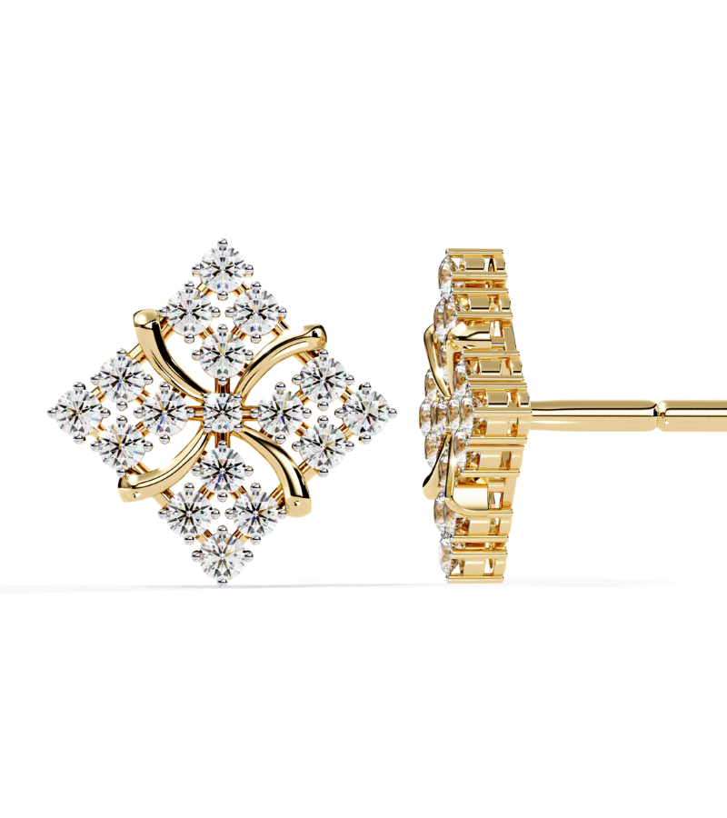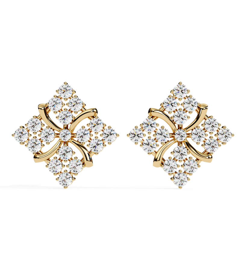A pair of gold earrings featuring a clover-inspired cluster of pavé diamonds arranged in a halo.- Design: four-leaf clover motif created from interlinked diamond clusters.