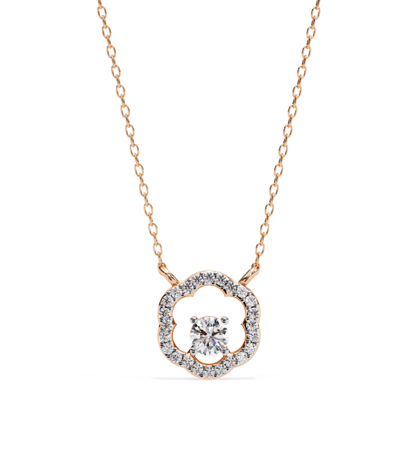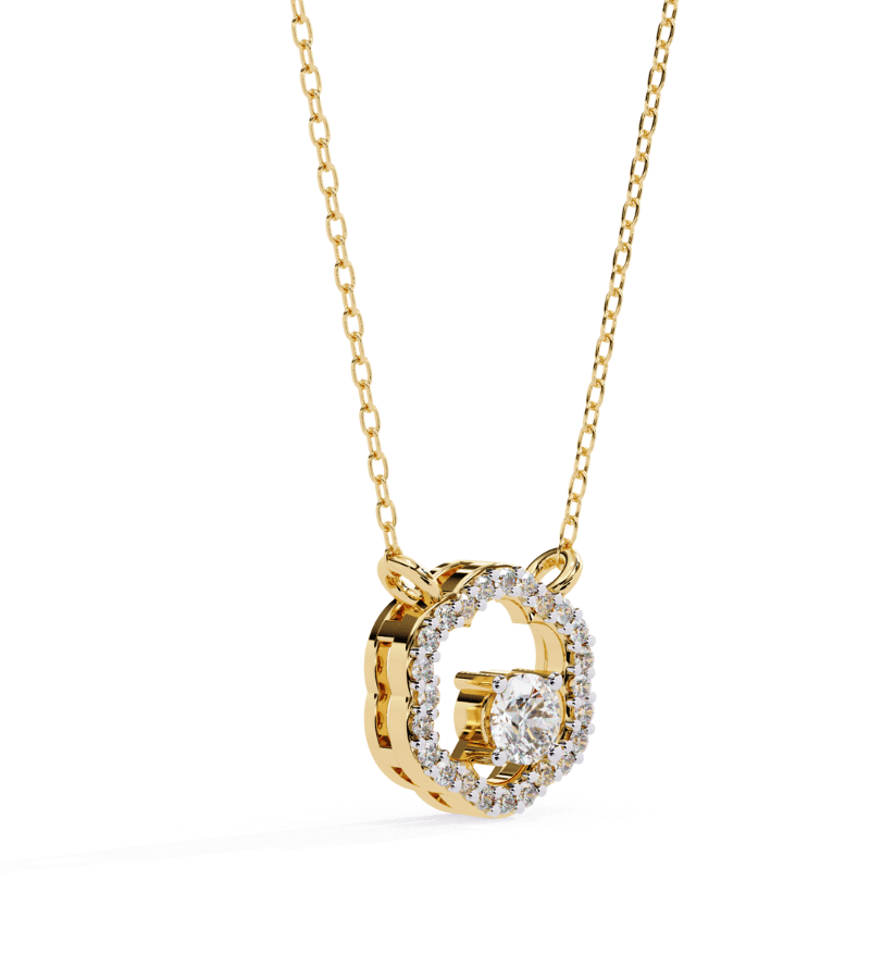 This pendant presents a delicate clover-shaped halo formed from pavé-set diamonds that encircle a brilliant center stone. Crafted in warm gold-tone metal, the halo’s open floral silhouette catches light from every angle while the central diamond sparkles at its core. Suspended from a refined gold chain, the pendant rests gracefully at the collarbone, offering a versatile focal point that complements both sophisticated evening outfits and refined daywear.