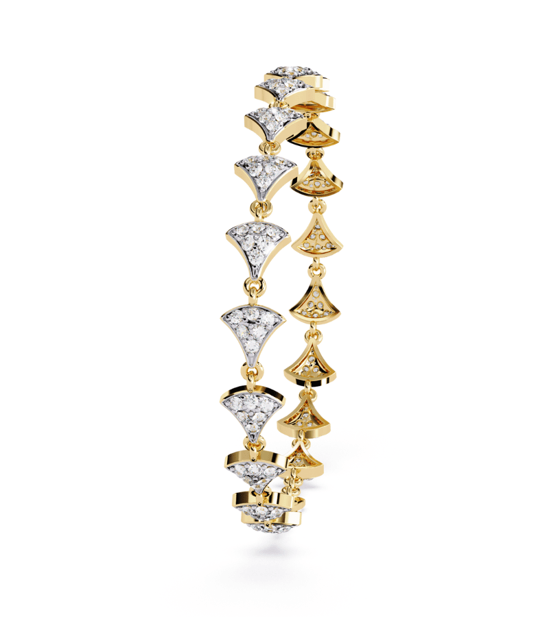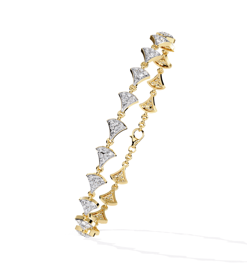 Two-tone bracelet with alternating diamond-encrusted crescent motifs in gold and white tones, linked to form a gentle arc around the wrist.