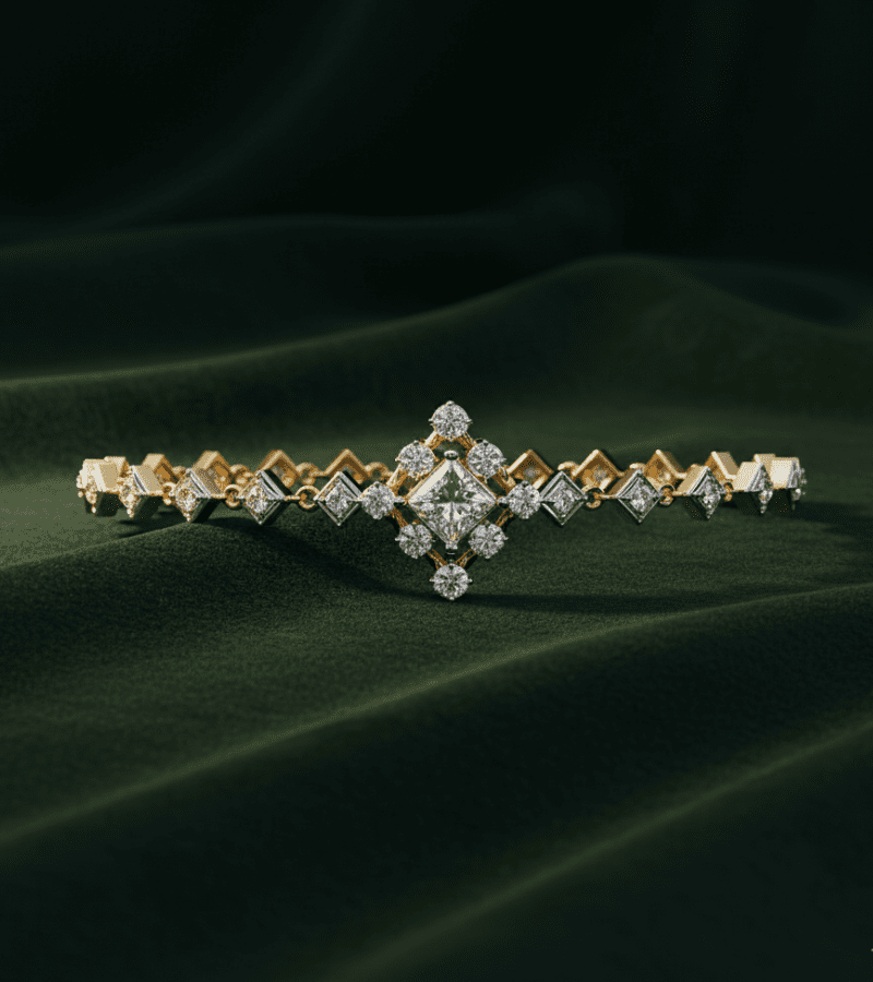 - Motif: radiant diamond blossom at center, flanked by geometric diamond accents for a regal look.