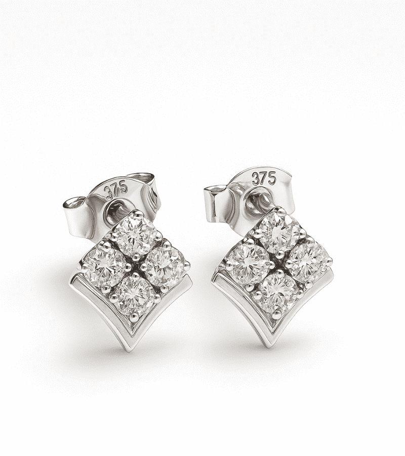 Silver-tone square stud earrings with a grid of four round diamonds on each face.- Design: four-quarter grid of pavé diamonds set in a square, beveled frame.