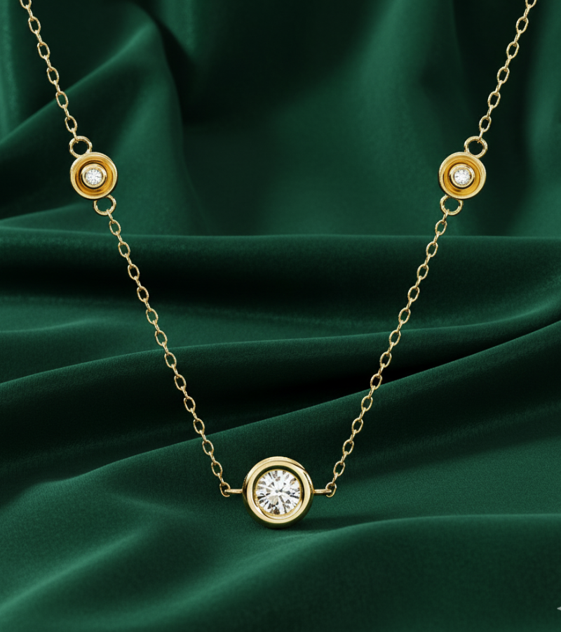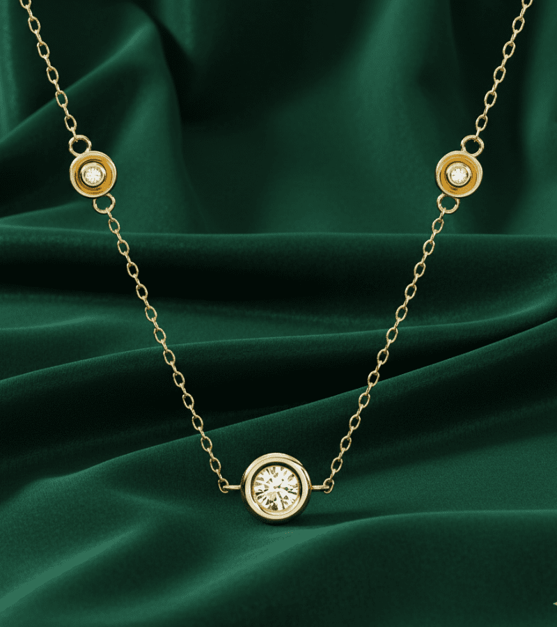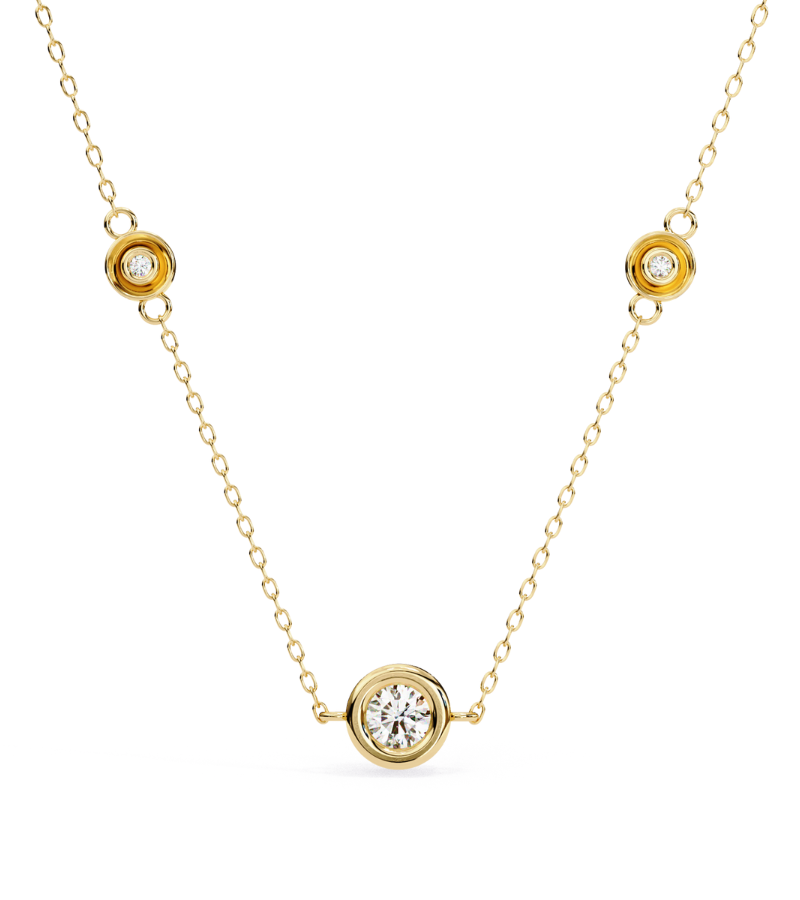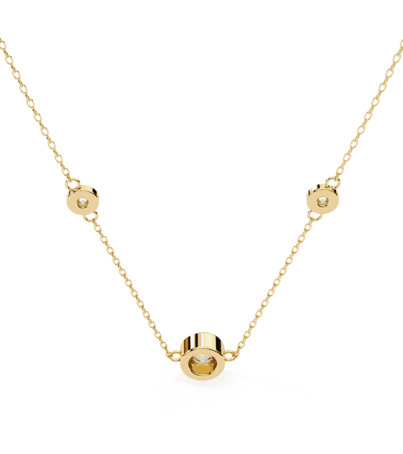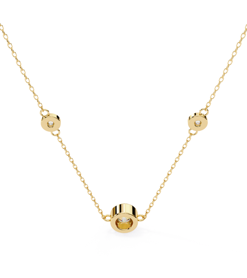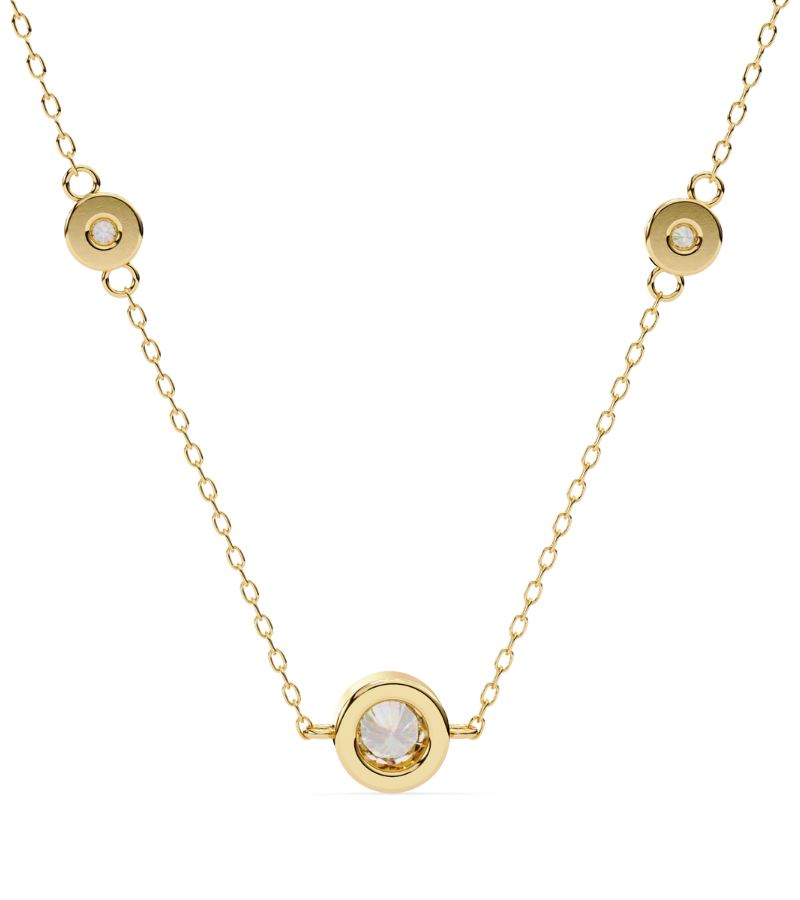 This pendant showcases a luminous central round diamond set in a smooth bezel, creating a clean halo effect. The chain passes through two dainty, circular stations accented with pavé stones, adding subtle sparkle while maintaining a balanced, cohesive look. Crafted in warm gold-tone metal, the piece rests at the collarbone on a delicate link chain, offering a sophisticated focal point that pairs beautifully with both casual outfits and formal ensembles.