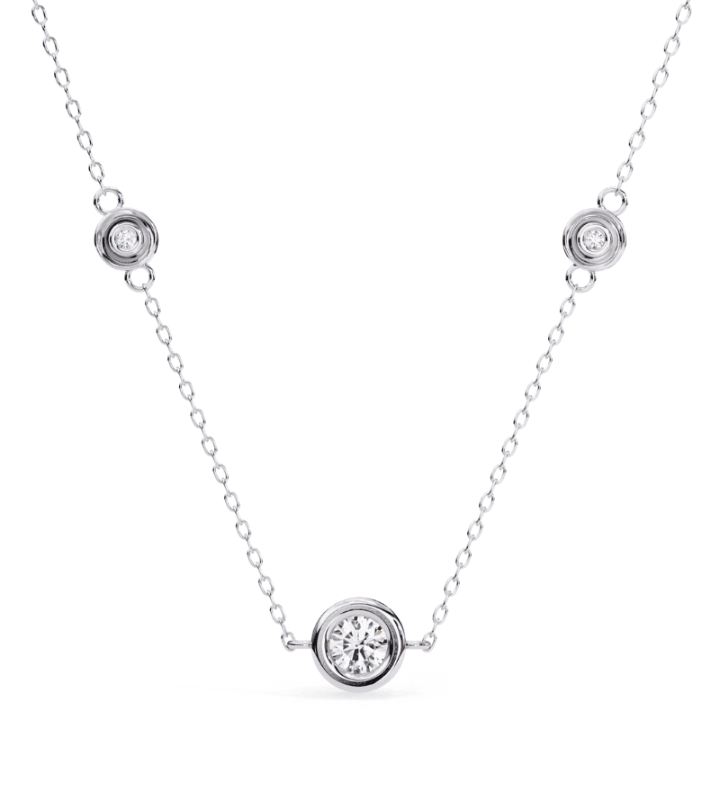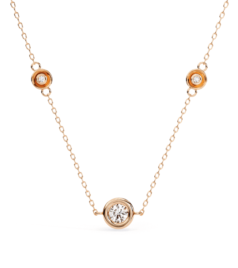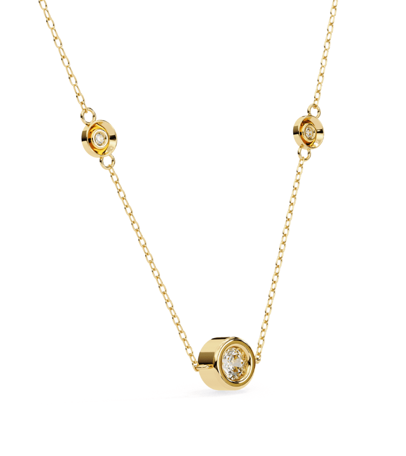 - Design: round bezel setting featuring a brilliant central diamond, flanked by decorative circular motifs on the chain.
