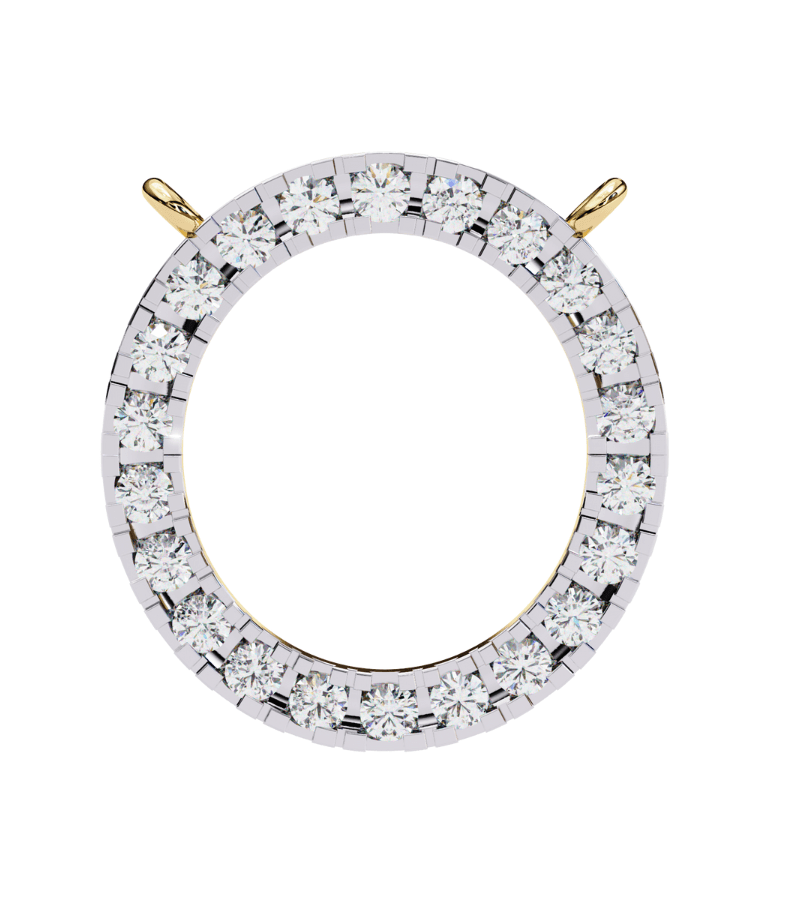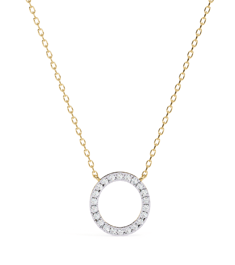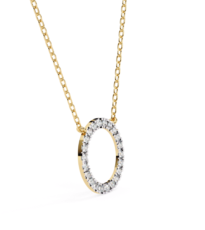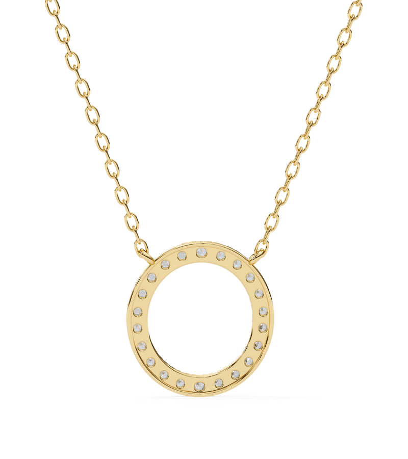 This pendant features a pristine gold-tone circle formed as a radiant diamond halo. The circumference is encrusted with pavé-set stones that catch light from every angle, creating a continuous ring of sparkle. Suspended from a slender gold chain, the pendant rests softly at the collarbone, offering a refined, versatile accent that pairs beautifully with both casual outfits and formal attire.