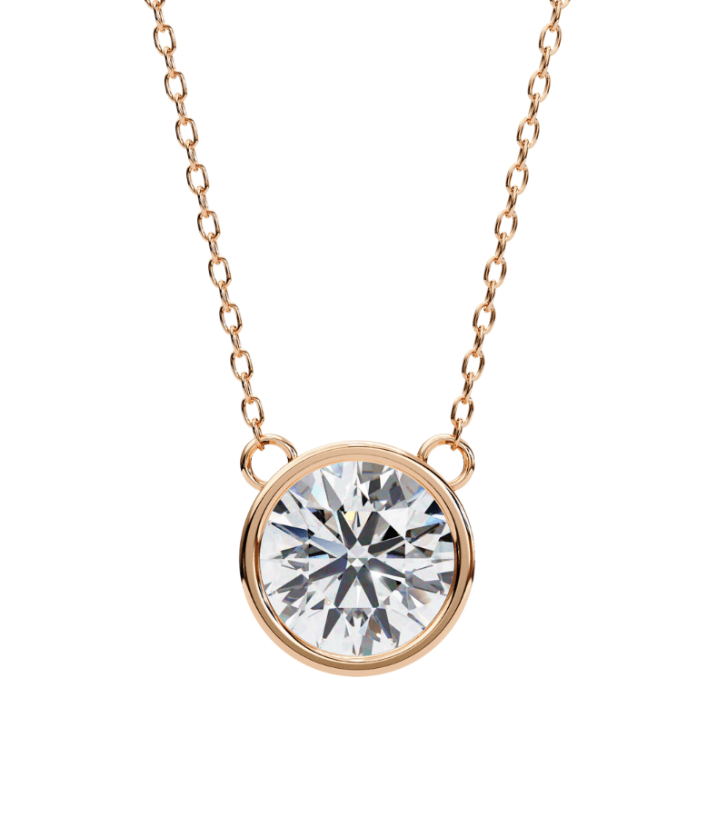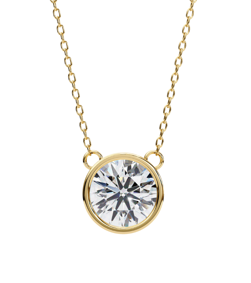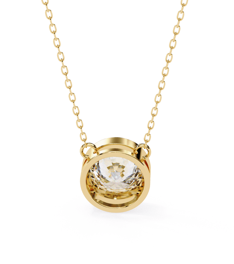 Gold-tone circular pendant with a large round-cut diamond-like stone encircled by a smooth bezel, suspended from a matching gold chain.
