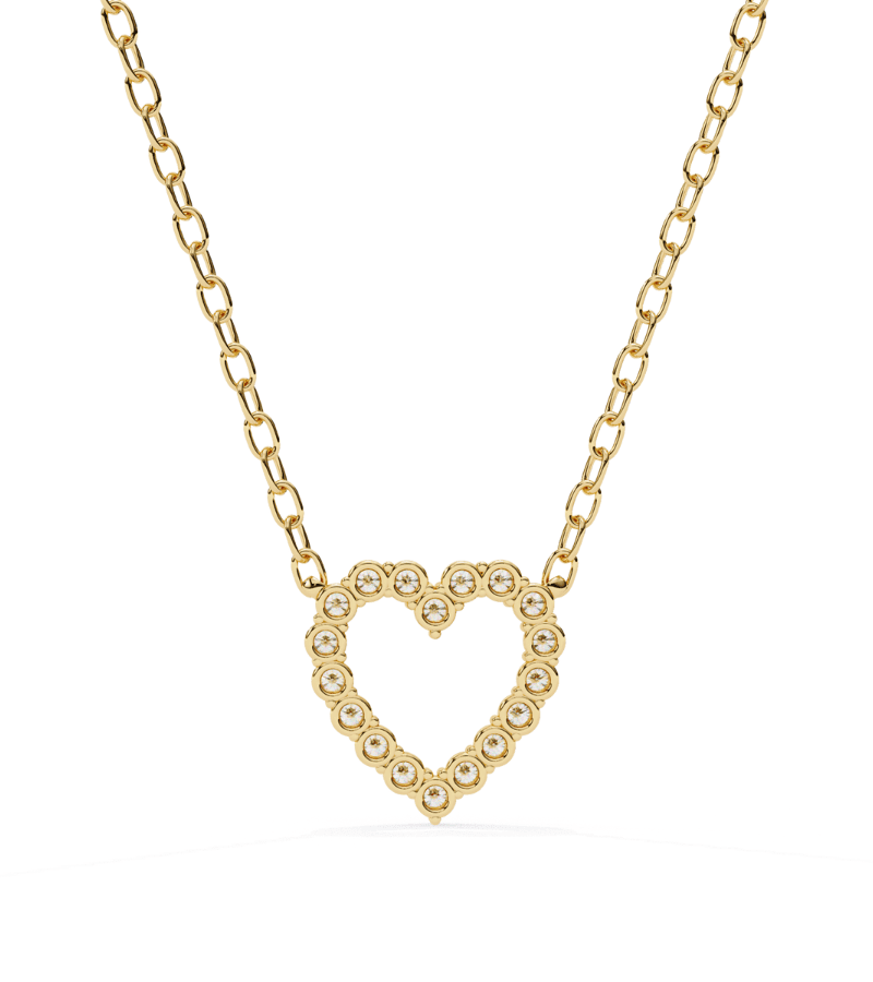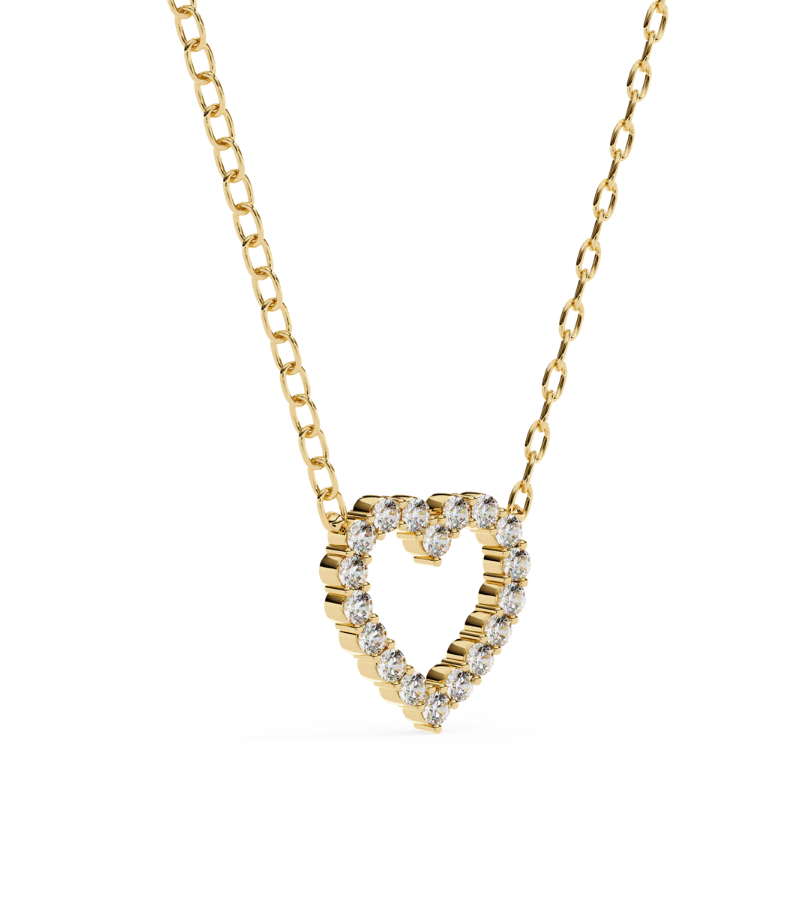 This pendant presents a graceful open-heart shape, fully outlined in pavé-set diamonds that shimmer along every edge. The diamonds are securely set in warm gold-tone metal, which enhances their brilliance and creates a cohesive, luxurious look. Suspended from a substantial gold chain, the heart rests at the collarbone, offering a romantic yet modern statement suitable for everyday refinement or elegant evening occasions.