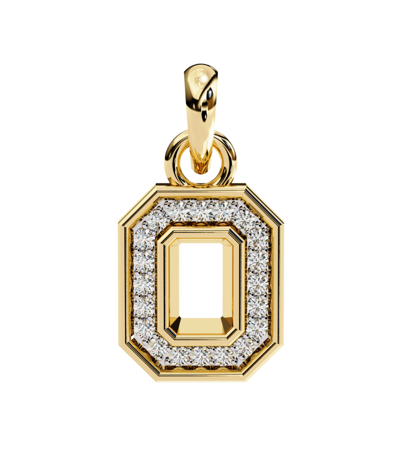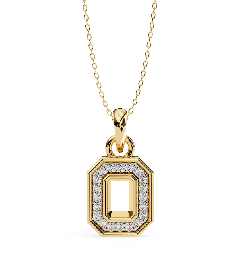 This pendant features a bold octagon shape set in warm gold-tone metal, outlined with a double halo of pavé diamonds that trace the geometric silhouette. The central void adds architectural intrigue while the surrounding stones deliver continuous sparkle from every angle. Suspended from a fine gold chain, the pendant rests gracefully at the collarbone, offering a sophisticated focal point that pairs beautifully with both formal attire and polished casual looks.