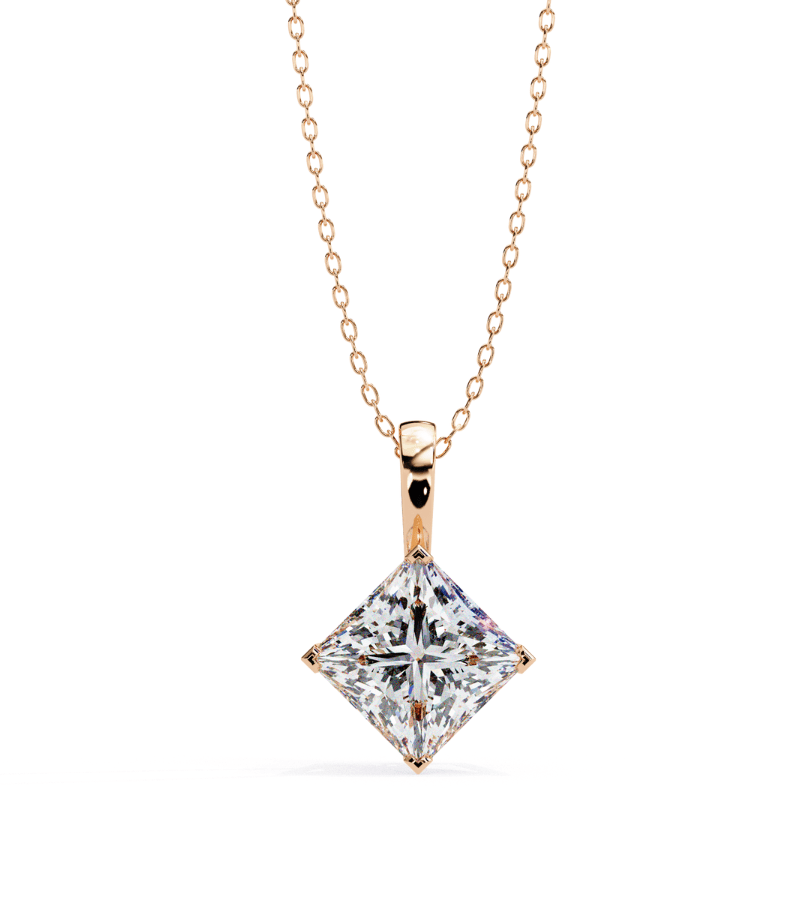 This pendant showcases a radiant diamond-style stone set in a refined gold bezel with a four-prong mechanism. The square-to-diamond orientation maximizes light return, delivering a crisp, multifaceted sparkle from every angle. Suspended from a slender gold chain, the pendant rests gracefully at the collarbone, offering a bold yet elegant statement. The warm gold-tone metal complements the stone’s clarity, making it suitable for daily refinement or glamorous evening ensembles.