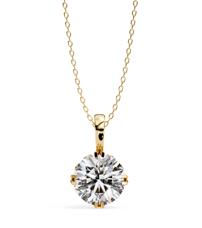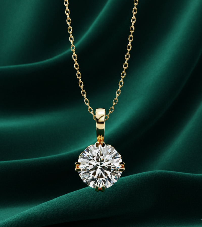 This pendant showcases a luminous round-cut diamond-style stone set in a refined gold prong setting. The facets maximize light return to deliver a brilliant, sparkling display from multiple angles. Suspended from a slender gold chain, the pendant rests gracefully at the collarbone, offering a timeless statement of refinement. The warm gold-tone metal complements the stone’s clarity and fire, making it suitable for daily wear or glamorous evening ensembles