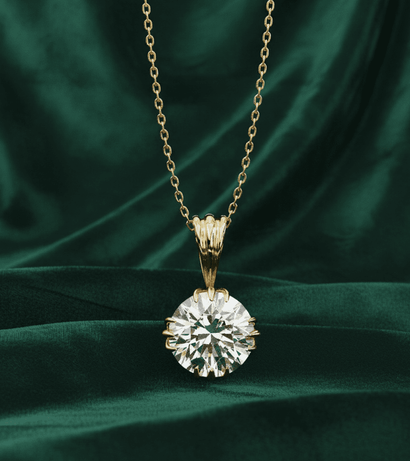 Gold-tone pendant featuring a brilliant round-cut diamond-style stone in a secure prong setting, hanging from a delicate gold chain.