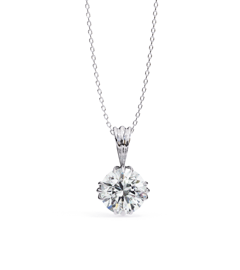 - Design: solitaire round-cut center stone with a classic four-prong bezel.