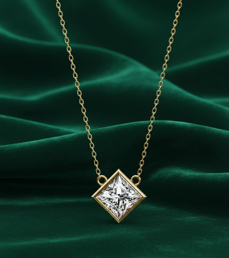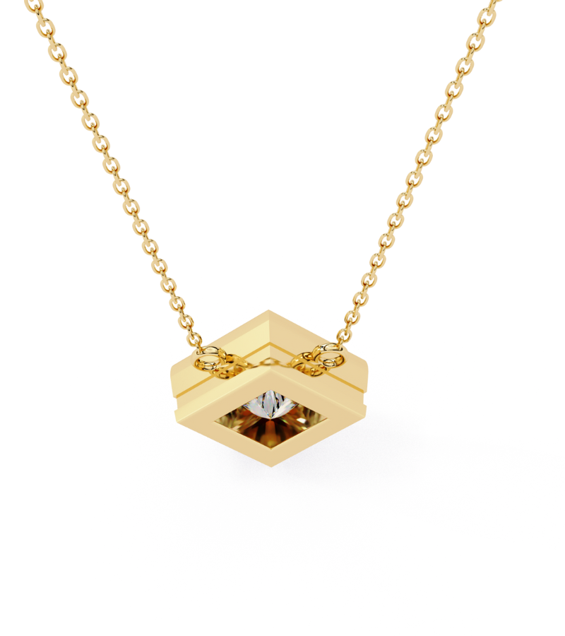 This pendant features a radiant square-cut diamond-style stone set within a refined gold bezel, oriented on a diagonal to form a diamond shape. The sleek, geometric frame adds a subtle halo and emphasizes the stone’s facets, maximizing light reflection. Suspended from a slender gold chain, the pendant rests at the collarbone, offering a modern yet timeless statement. The warm gold-tone metal complements the central stone’s clarity and fire, making it suitable for everyday refinement or glamorous evening ensembles