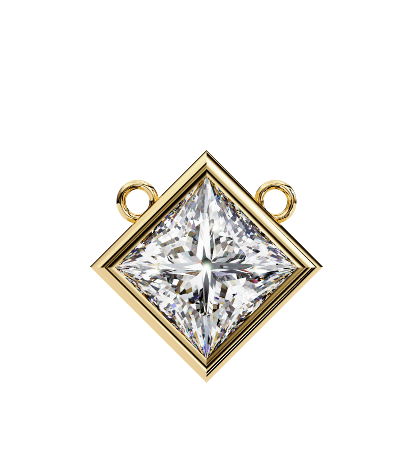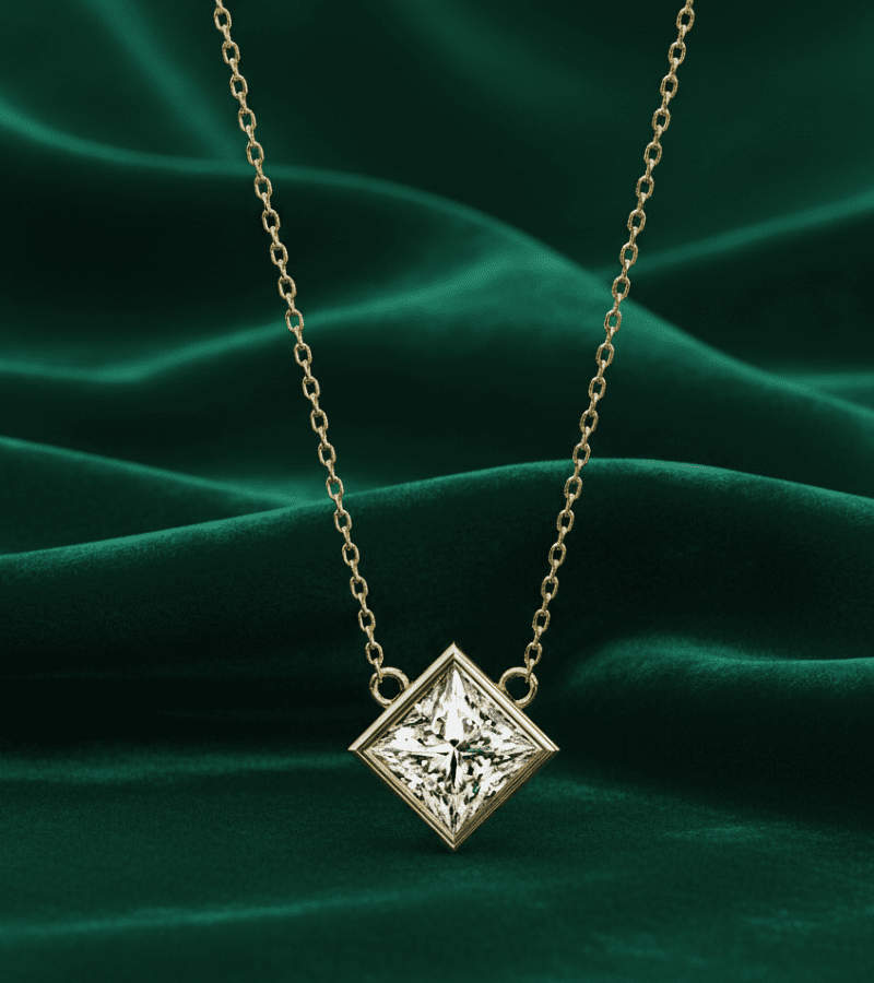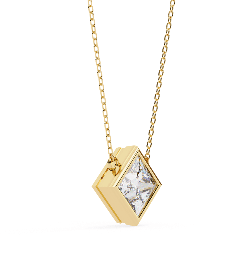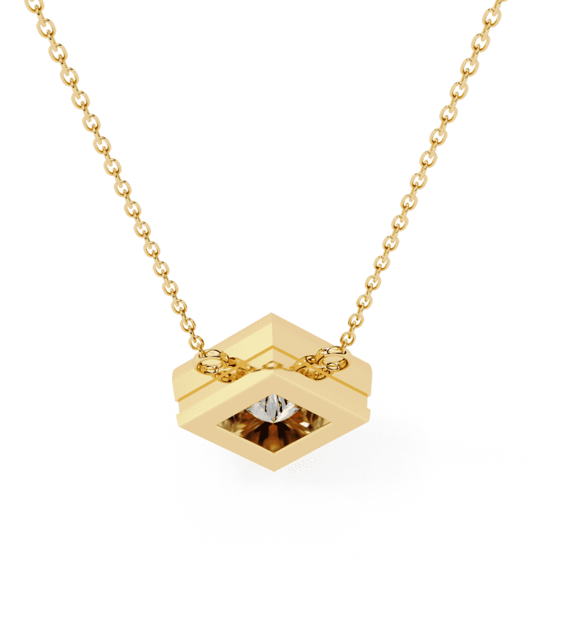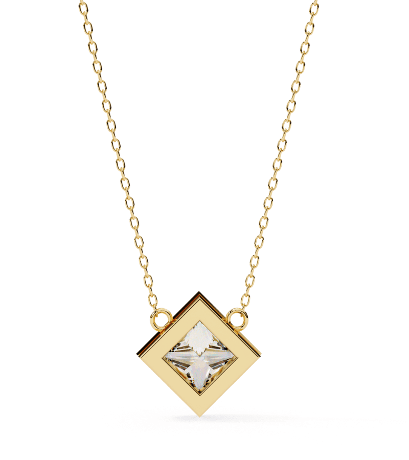 This pendant features a radiant square-cut diamond-style stone set within a refined gold bezel, oriented on a diagonal to form a diamond shape. The sleek, geometric frame adds a subtle halo and emphasizes the stone’s facets, maximizing light reflection. Suspended from a slender gold chain, the pendant rests at the collarbone, offering a modern yet timeless statement. The warm gold-tone metal complements the central stone’s clarity and fire, making it suitable for everyday refinement or glamorous evening ensembles.