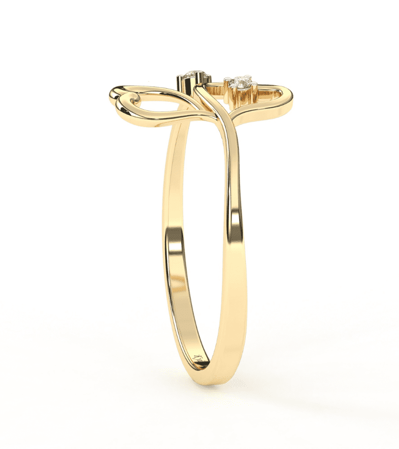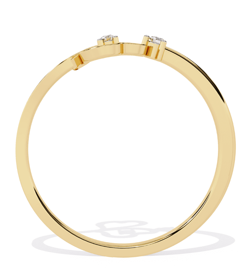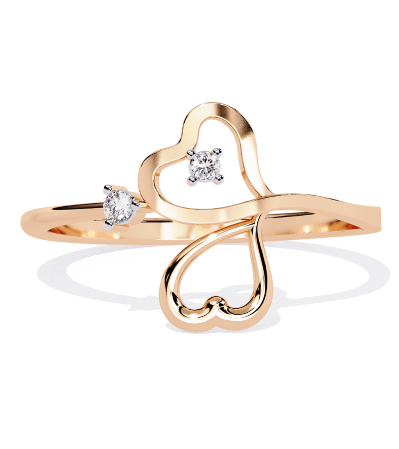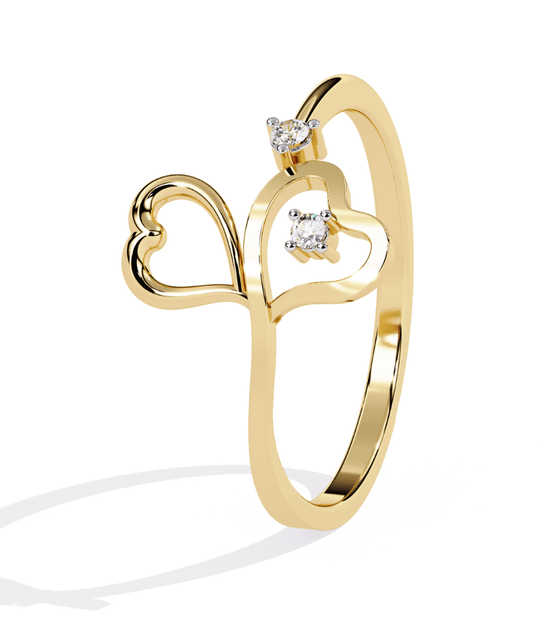 This ring showcases a graceful open-work design of two intertwined heart outlines in warm gold-tone metal. Each heart is accented with a small diamond, adding a touch of sparkle without overpowering the delicate silhouette. The open setting creates a light, airy feel that catches the light from multiple angles, making the piece versatile for daily wear or romantic evenings. The tapered band ensures a comfortable fit while maintaining a refined, modern aesthetic.