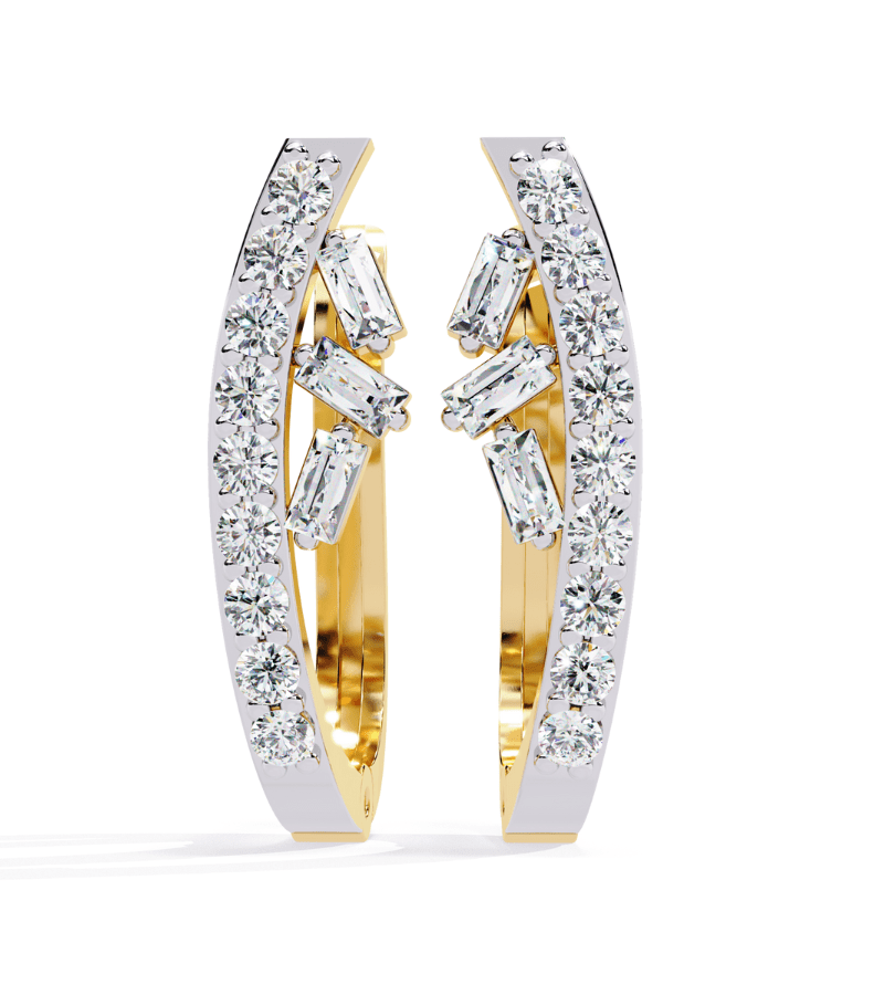 Dual Halo Diamond Arc Earrings combine sculptural geometry with timeless sparkle. Each arcuate hoop is lined with a continuous pavé of round diamonds on the outer edge, forming a luminous halo, while a contrasting inner row showcases alternating rectangular baguette diamonds set to catch light from multiple angles. The warm gold-tone base enhances the clarity and fire of the stones, creating a bold yet elegant statement piece. With their balanced, open design and sophisticated two-tone shimmer, these earrings are ideal for gala events, weddings, or upscale soirées, offering enduring glamour and refined presence.