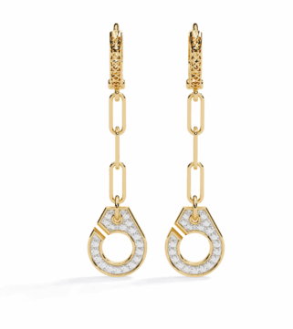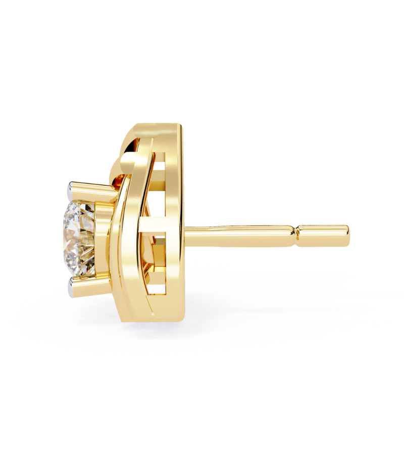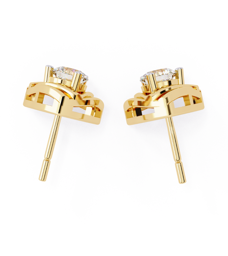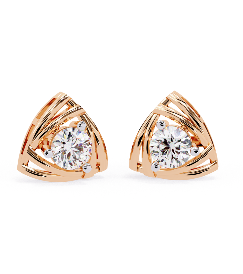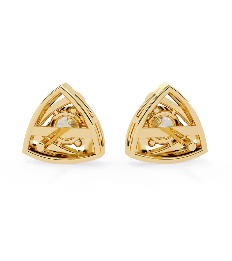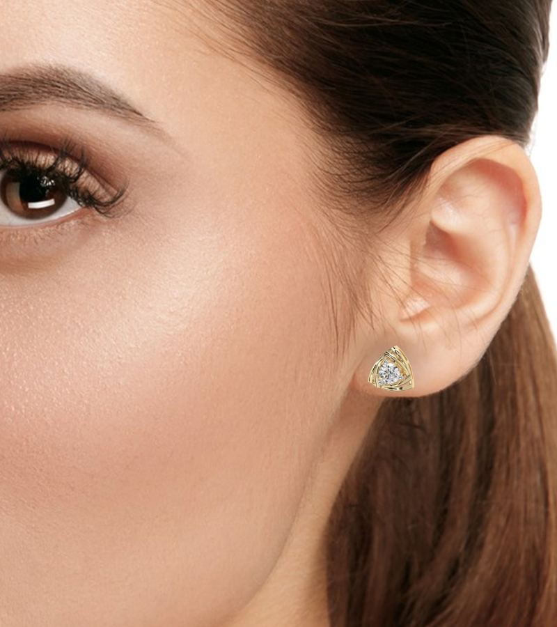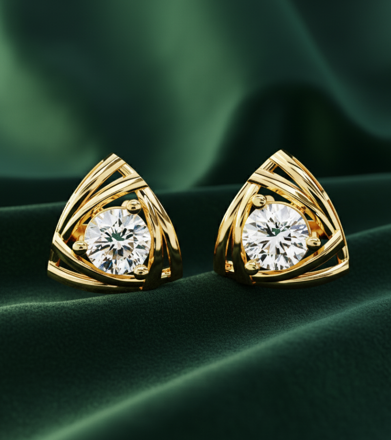 These earrings feature a bold, geometrically inspired triangle silhouette crafted in warm gold-tone metal. Each piece centers a radiant round diamond, securely held by a multi-arc cradle that wraps around the stone in a dynamic, intersecting design. The sweeping arcs create negative space that accentuates the diamond’s fire from every angle, while the bright gold setting adds warmth and luxury. Finished with comfortable posts, they deliver a striking, sophisticated look that transitions effortlessly from evening attire to refined daytime outfits.