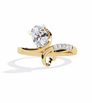 - Design: sculptural triple-arc frame in warm gold tones surrounding a round central diamond.