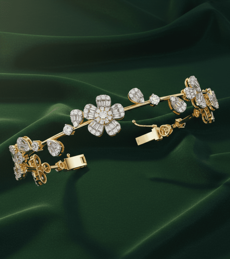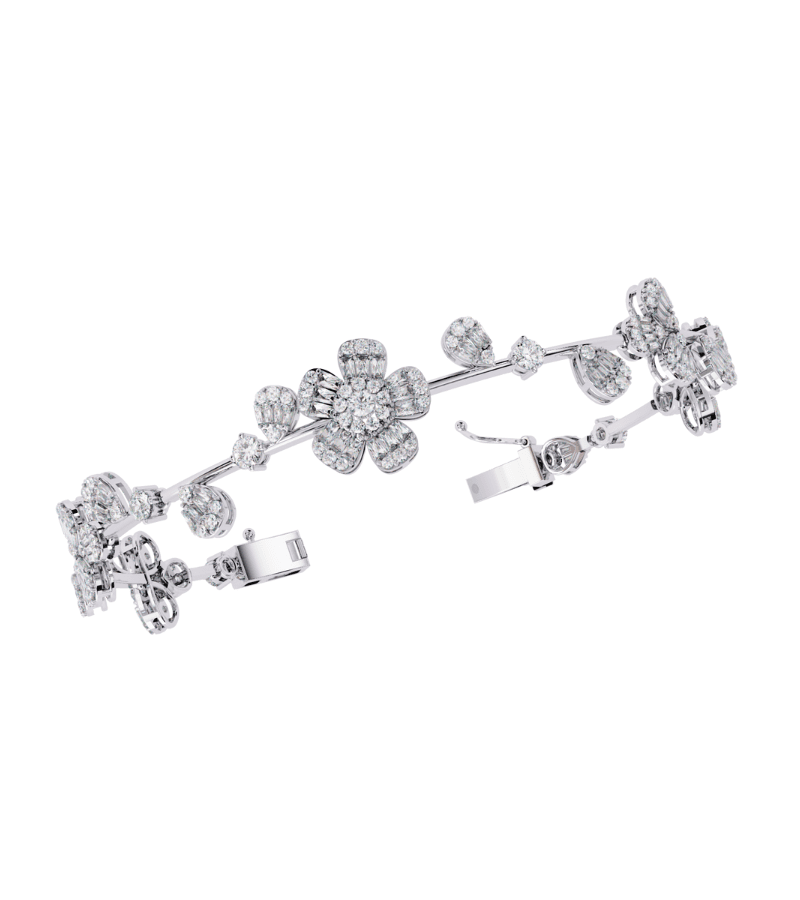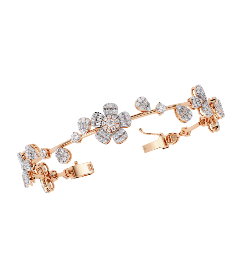 - Design: botanical bloom motif with multiple diamond-studded petals along a flexible band.