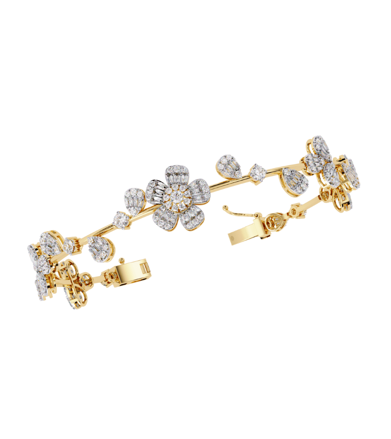 This bracelet showcases a radiant floral design in warm gold-tone metal, with a sequence of diamond-encrusted blossoms and petal motifs linked along a pliant band. Each blossom is crafted from petal-shaped segments set with pavé diamonds that catch light from every angle, creating a continuous garden of shimmer around the wrist. The meticulous arrangement combines bold botanical elements with delicate connectors, delivering both structure and movement. Finished with a secure clasp, this piece exudes opulent elegance, ideal for formal occasions, weddings, or as a standout everyday luxe statement.