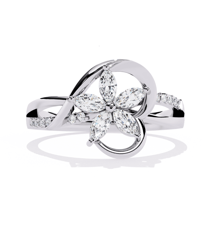 This ring centers a radiant floral motif, with four marquise-cut diamonds forming a graceful four-ppetal bloom set in a warm gold-tone band. The petals surround a delicate central point, creating a luminous centerpiece that catches light from every angle. The band is intermittently adorned with pavé diamonds, adding continuous sparkle along the finger while maintaining an airy, elegant silhouette. A timeless, feminine design that pairs beautifully with other jewelry and elevates evening wear or everyday luxury.