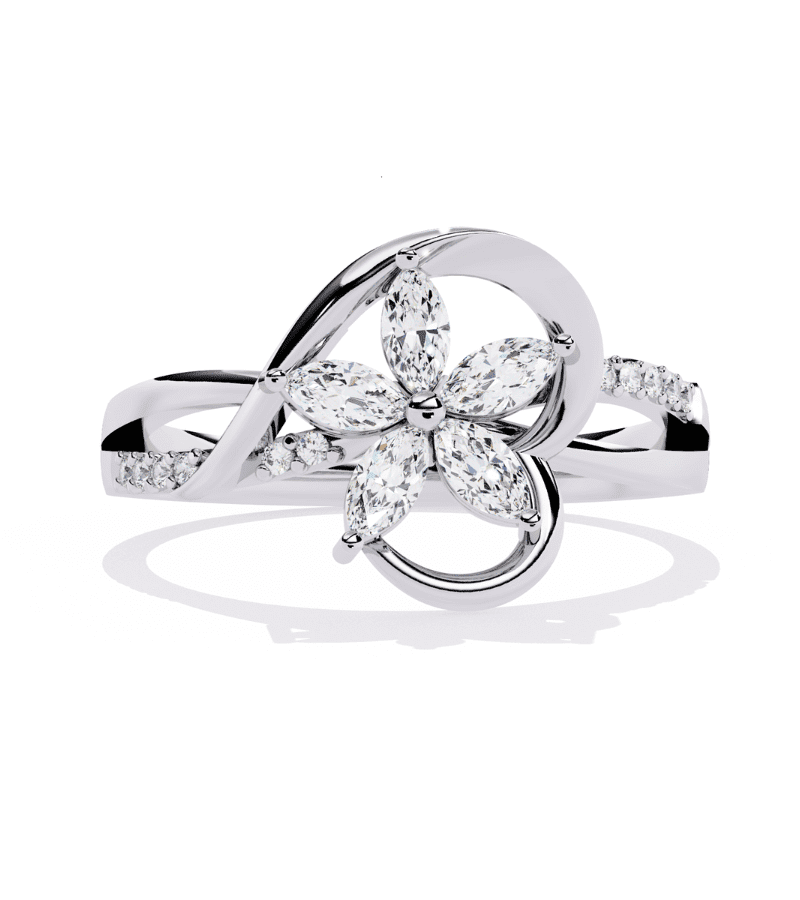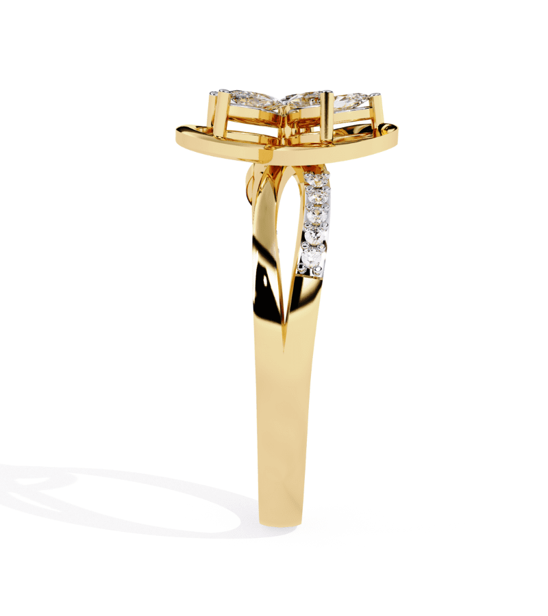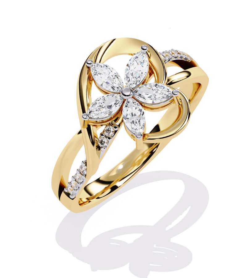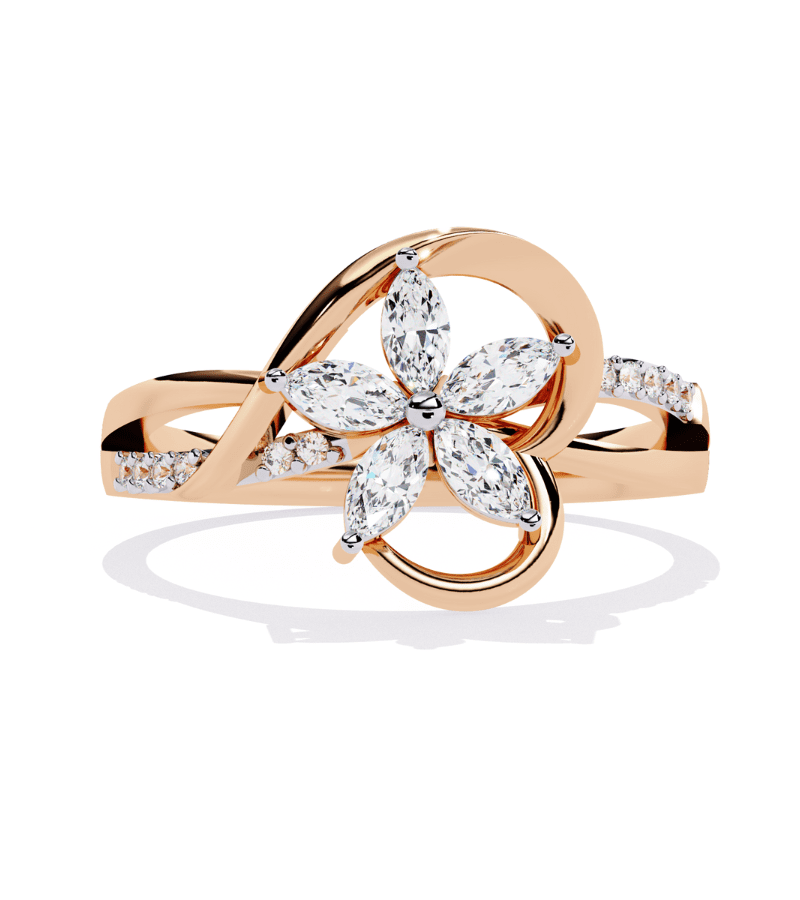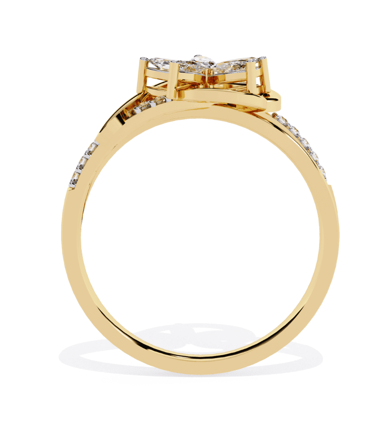 This ring centers a radiant floral motif, with four marquise-cut diamonds forming a graceful four-petal bloom set in a warm gold-tone band. The petals surround a delicate central point, creating a luminous centerpiece that catches light from every angle. The band is intermittently adorned with pavé diamonds, adding continuous sparkle along the finger while maintaining an airy, elegant silhouette. A timeless, feminine design that pairs beautifully with other jewelry and elevates evening wear or everyday luxury.