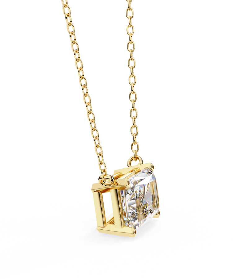 Gold-tone pendant featuring a large rectangular emerald-cut diamond-style stone set in a minimal four-prong bezel, suspended from a delicate gold chain.