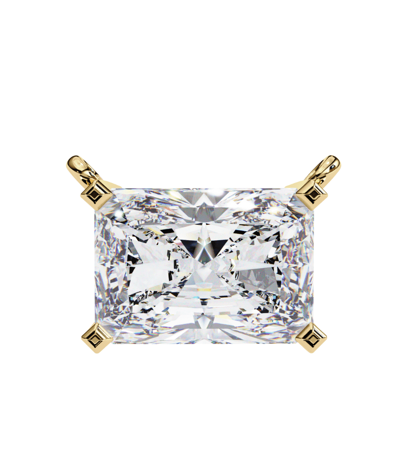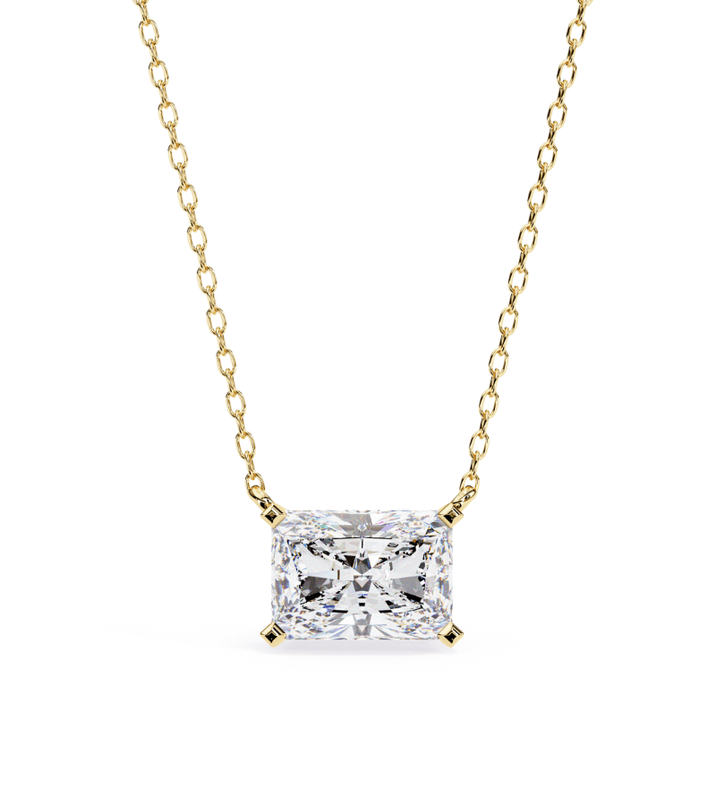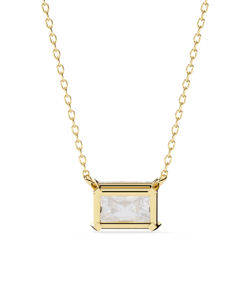 This pendant showcases a radiant rectangular emerald-cut diamond-style stone set within an elevated gold bezel that amplifies its crisp, mirror-like flashes. The elongated silhouette maximizes light return across the step-cut facets, offering a refined brilliance that draws attention naturally. Suspended from a delicate gold-tone chain, the stone rests elegantly at the collarbone for a sophisticated and minimalist aesthetic. Designed for both everyday polish and elevated evening attire, this piece captures a perfect balance of contemporary refinement and timeless luxury.