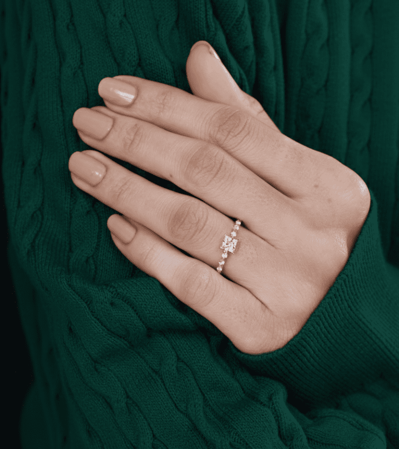 Emerald Cascade Halo Ring features a striking square-cut center diamond anchored by a luminous halo, while a series of pavé stones flow along the slender band, creating a graceful cascade of light. The cool silver-tone metal highlights the diamond’s clarity and lends a modern, architectural feel to the piece. This ring balances timeless bridal glamour with contemporary design, making it ideal for engagements, special occasions, or everyday luxury with a touch of radiant sophistication