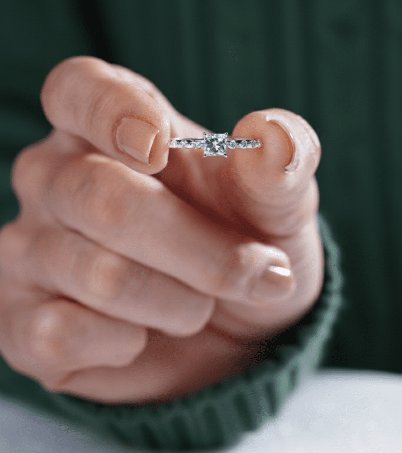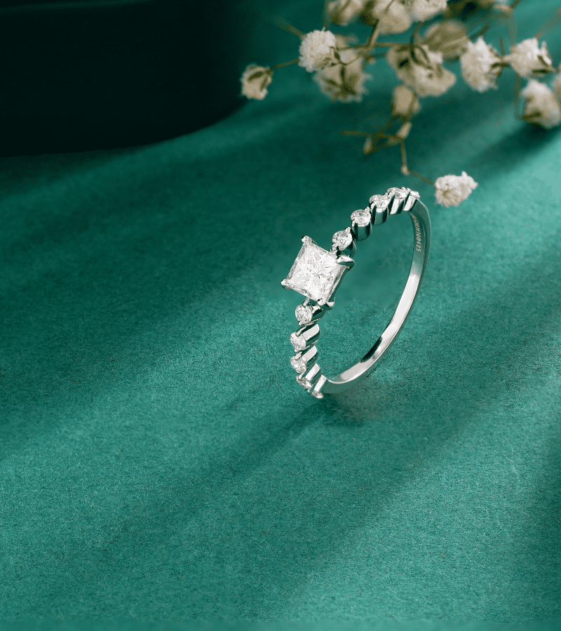 Sterling-silver band with a square-cut center diamond and a line of smaller pavé stones cascading along the shank.- Design: square-cut center diamond framed by a radiant halo, with pavé stones along the band.