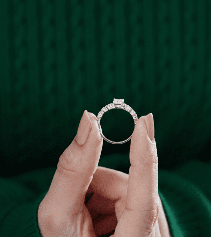 - Design: square-cut center diamond framed by a radiant halo, with pavé stones along the band.