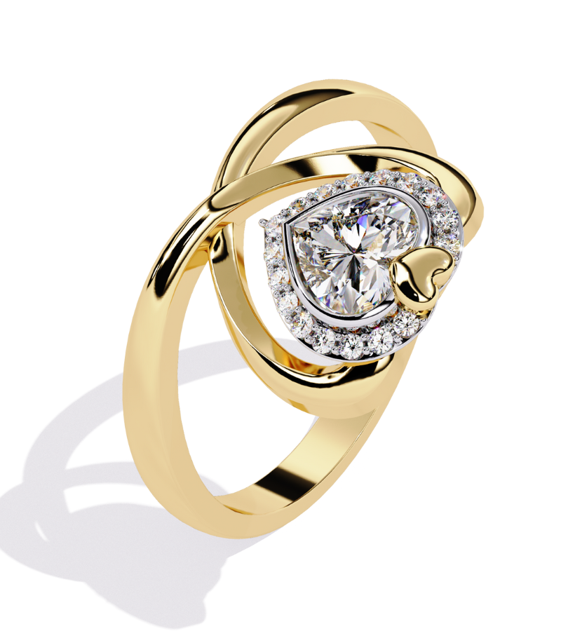 Gold-tone ring featuring a heart-shaped halo of pavé diamonds around a brilliant central stone, with an elegant interwoven band motif.
