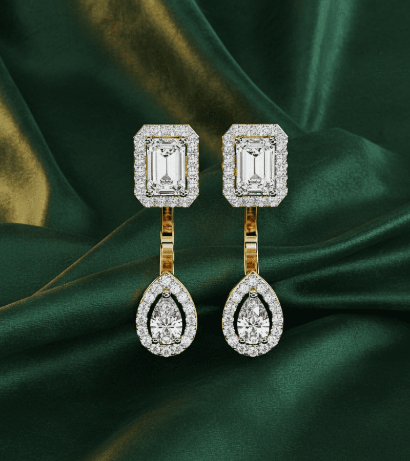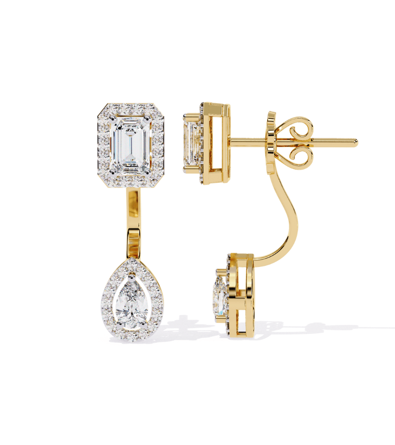 Emerald Mirage Diamond Drop Earrings take inspiration from classic couture jewelry, blending a structured geometric upper setting with fluid, light-catching movement below. The emerald-cut center stone shines within a halo of pavé diamonds, creating a bold and radiant focal point. A polished gold stem transitions into a teardrop pendant adorned with clustered diamonds for breathtaking brilliance. Modern, glamorous, and exquisitely detailed, this pair is designed for unforge