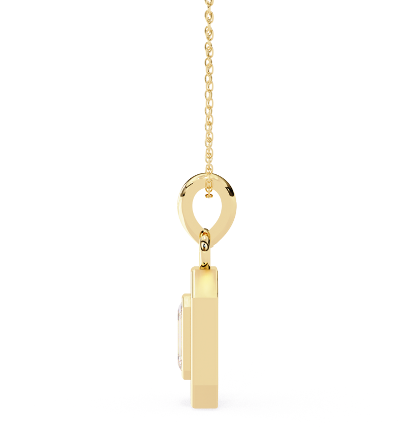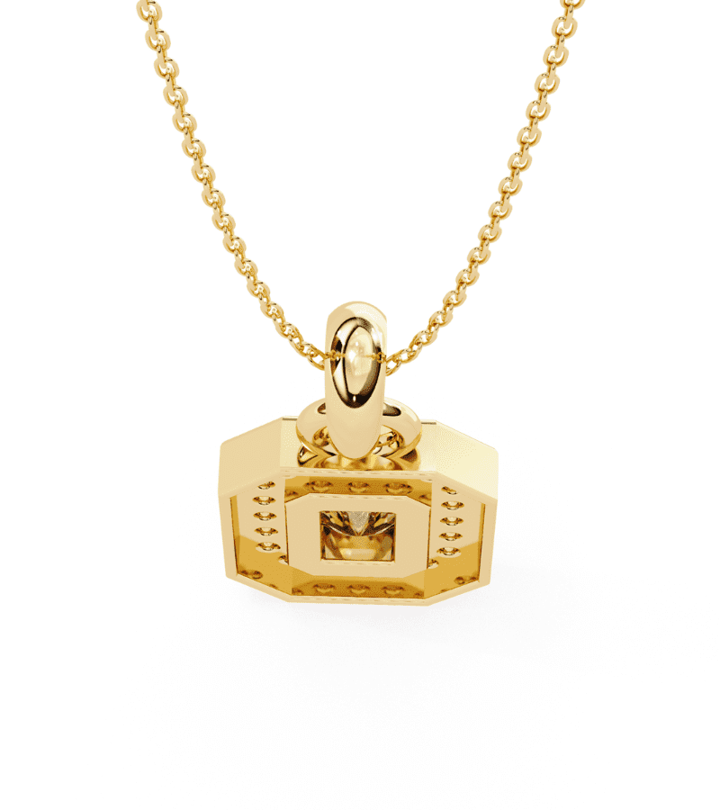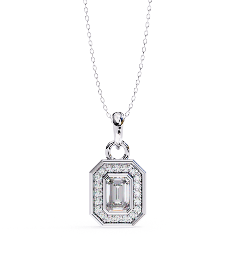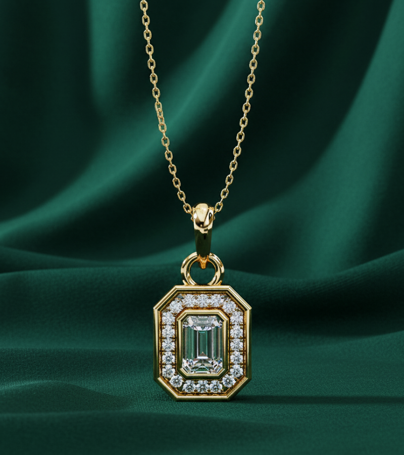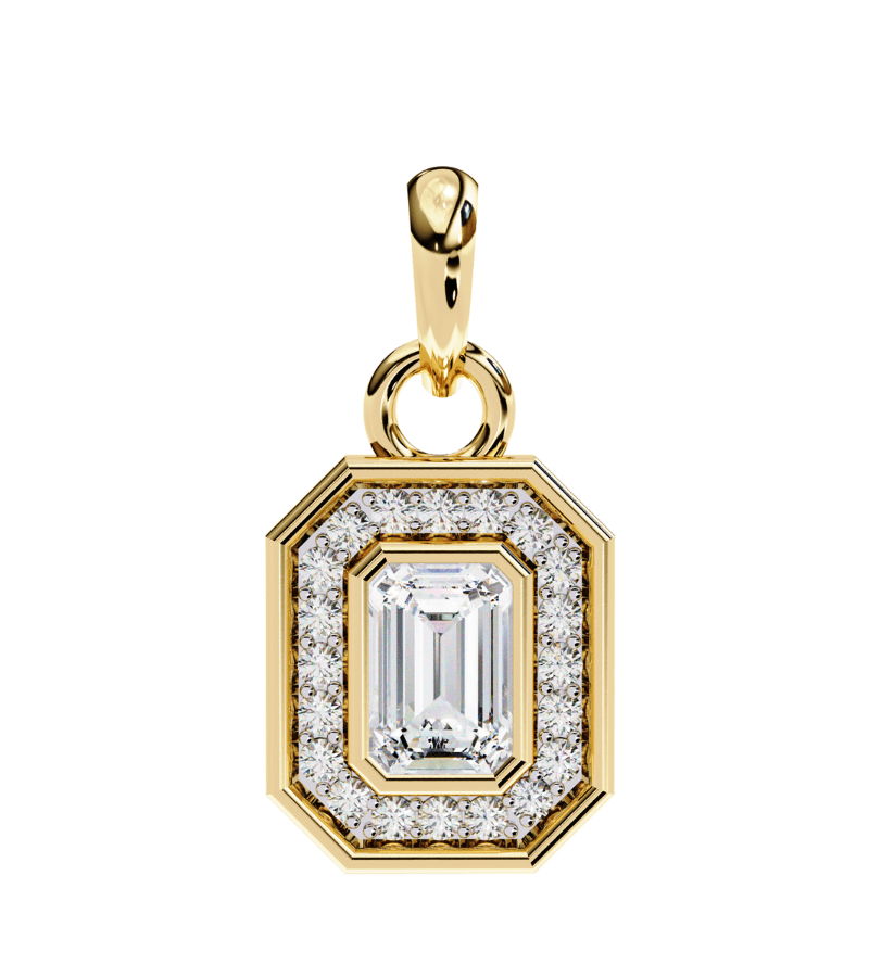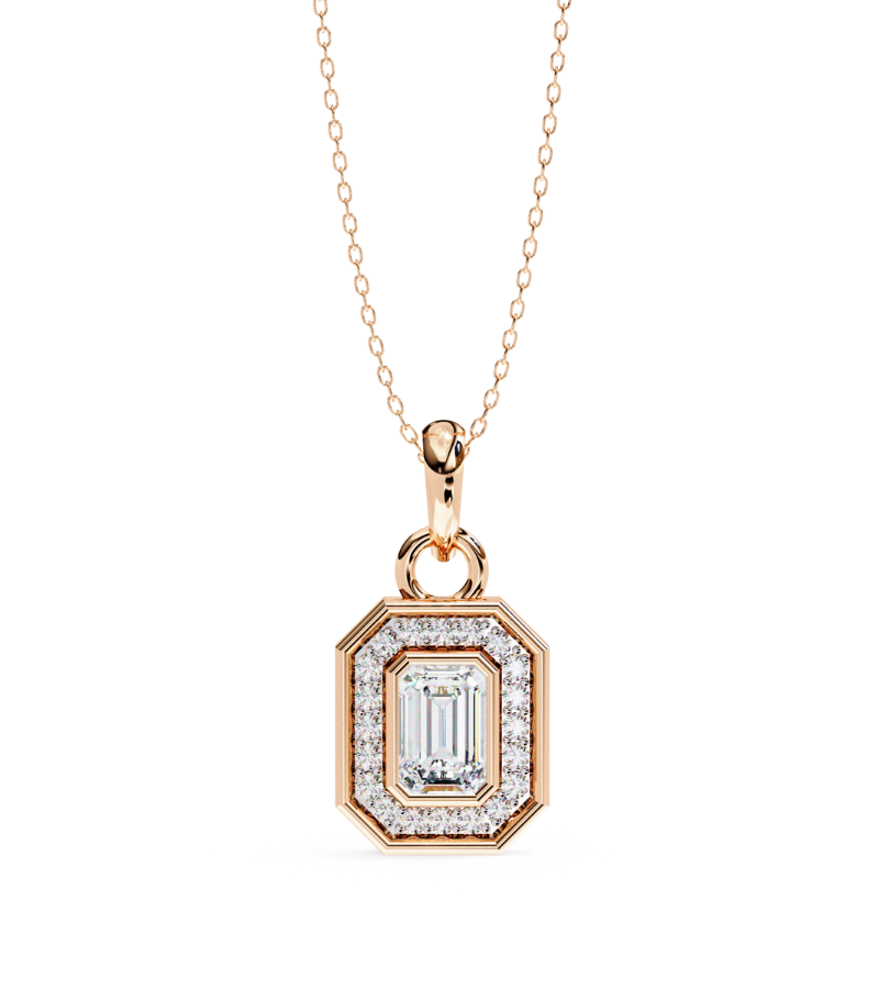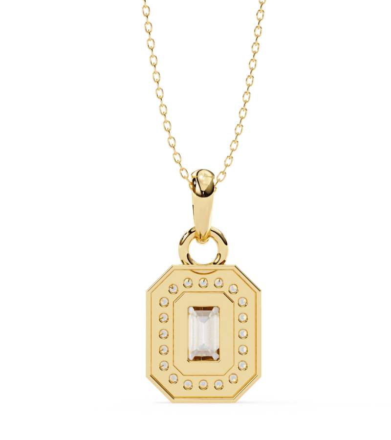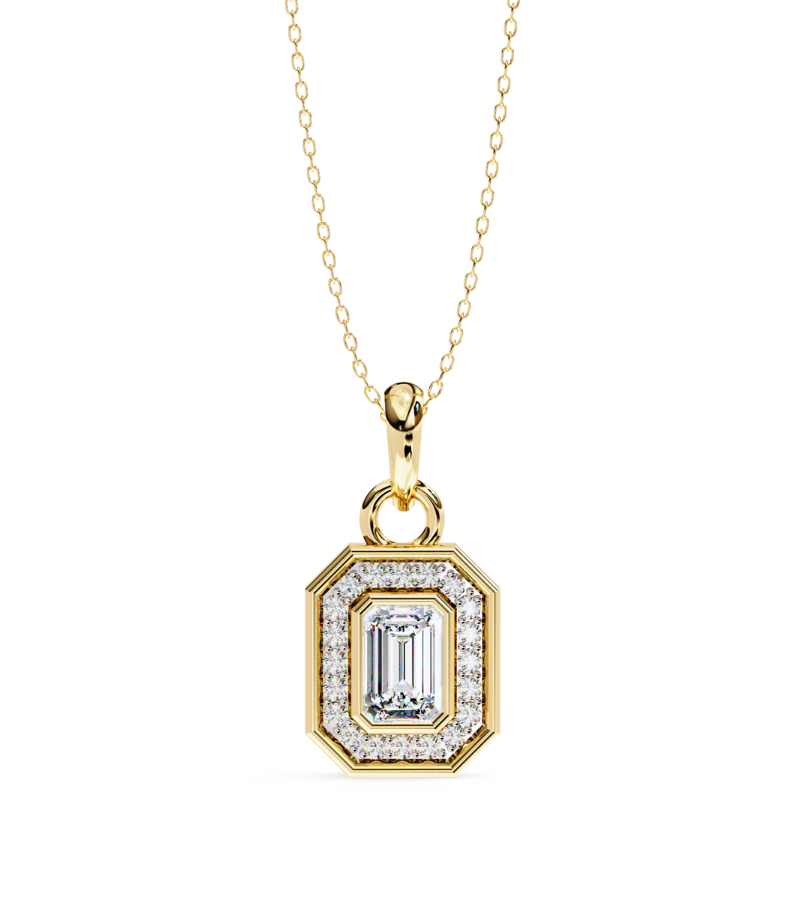 This pendant features a striking emerald-cut centerpiece set in a warm gold-tone frame, encased by a stepped octagonal halo encrusted with pavé diamonds. The layered geometry creates depth and a modern, architectural allure, while the surrounding sparkle amplifies the piece’s presence. Suspended from a refined gold chain, the pendant rests at the collarbone, delivering a bold yet sophisticated focal point that complements formal ensembles and elevated everyday styling.