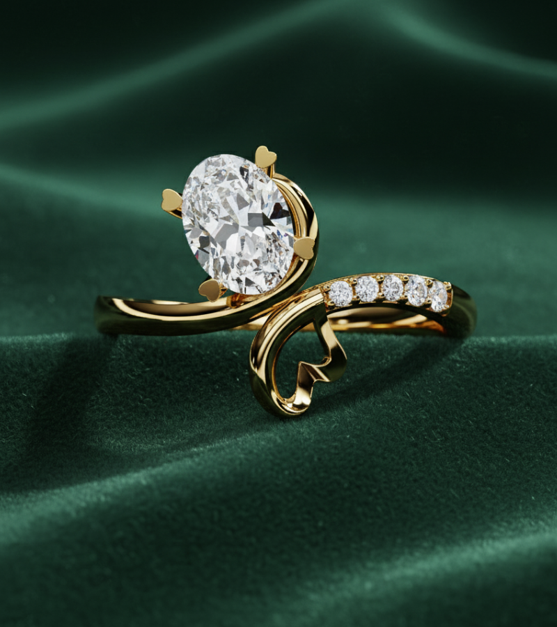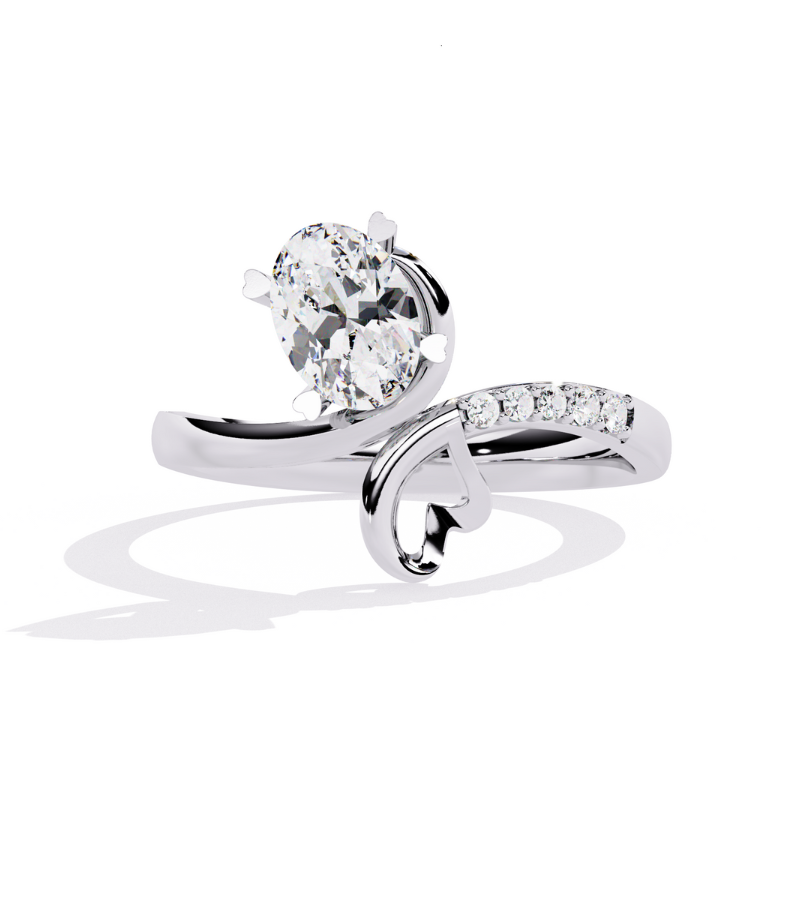 - Design: oval center stone held by four heart-shaped prongs forming a romantic heart motif.