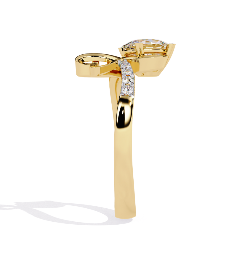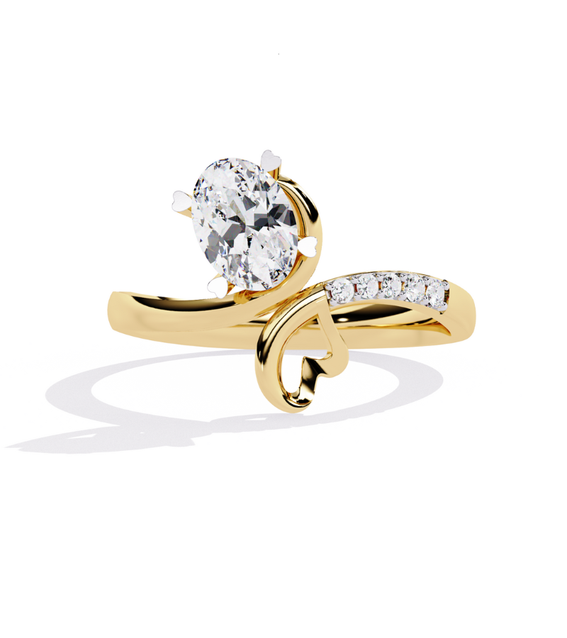 This ring centers an oval-cut diamond cradled within a graceful heart-inspired embrace crafted in warm gold-tone metal. The central stone is accented by a subtle halo of pavé diamonds and is flanked by a sweeping, pavé-studded band that mirrors the curve of the heart. The design blends timeless romance with modern sophistication, creating a statement piece that captures light from every angle. Perfect for engagements, anniversaries, or daily luxury with a touch of whimsy.