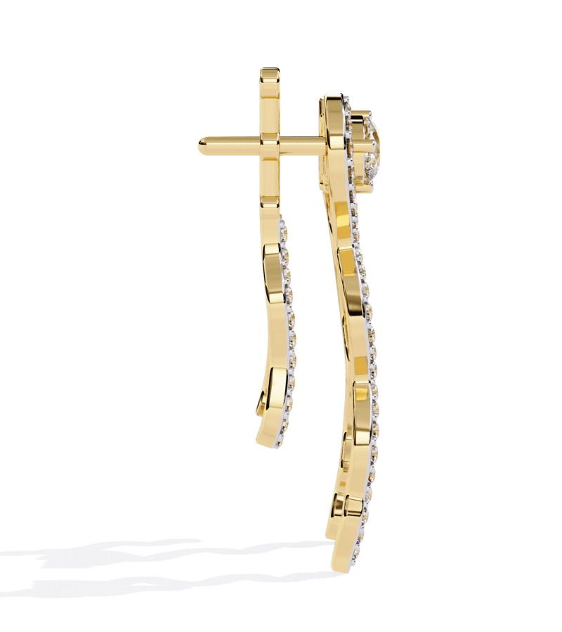 Gold-tone drop earrings with a twisting serpentine line encrusted in pavé diamonds and a pear-shaped diamond accent at the top.- Design: two sinuous, open-scroll falls lined with pavé diamonds, mirroring each other.