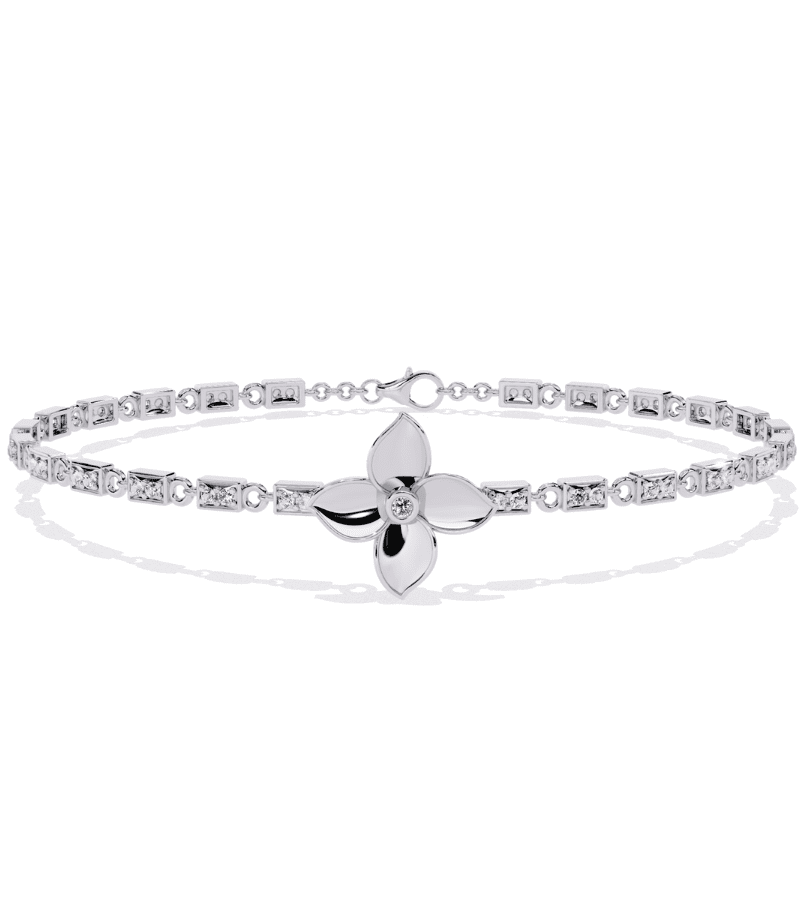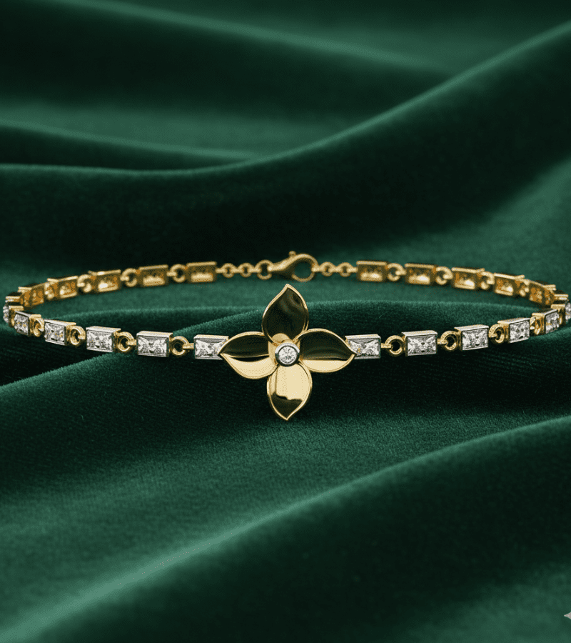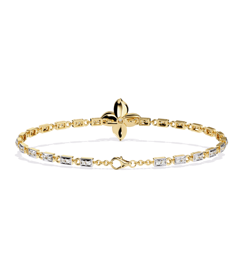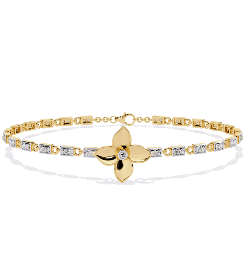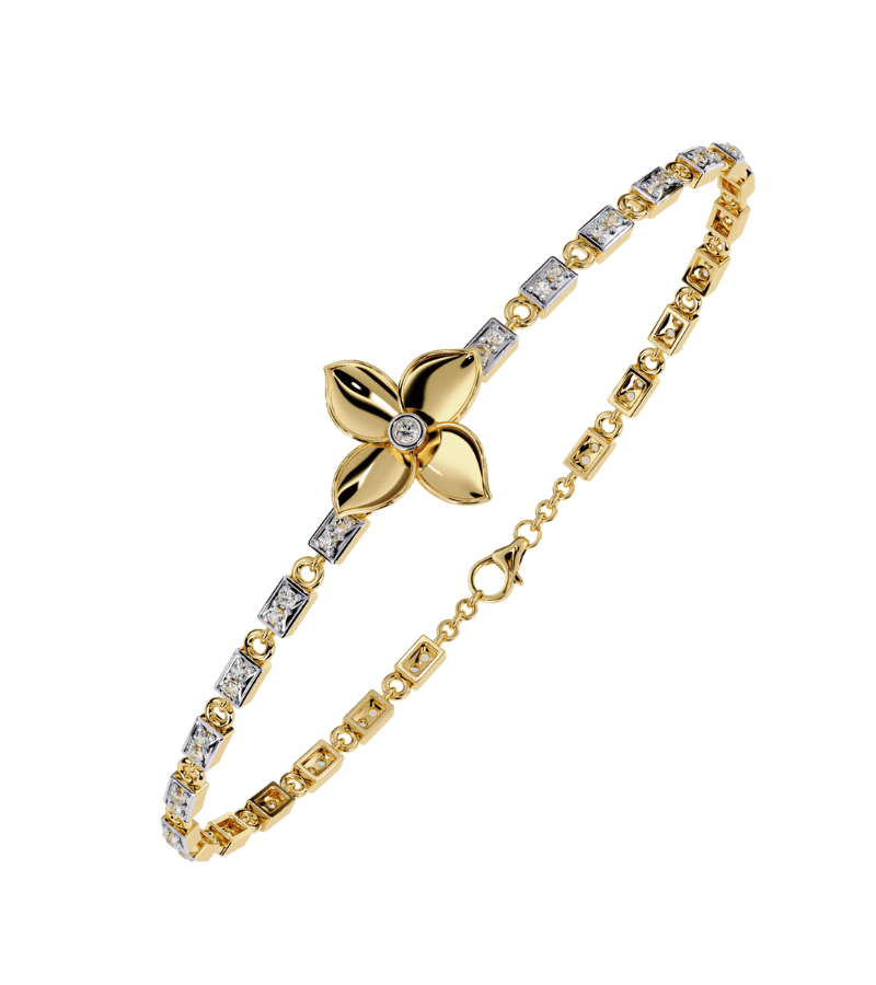 This bracelet showcases a graceful gold-tone band anchored by a prominent four-petal flower centerpiece, each petal sculpted into a polished gold silhouette around a shimmering pavé diamond core. Complementing the floral focal point, a series of square-cut diamond stations are spaced along the linked chain, creating a rhythmic play of sparkle and elegance. The blend of botanical aesthetics and geometric refinement results in a timeless, feminine accessory that transitions effortlessly from casual sophistication to elevated evening style. Ideal for anniversaries, gifting, and adding a touch of luxe radiance to any ensemble.